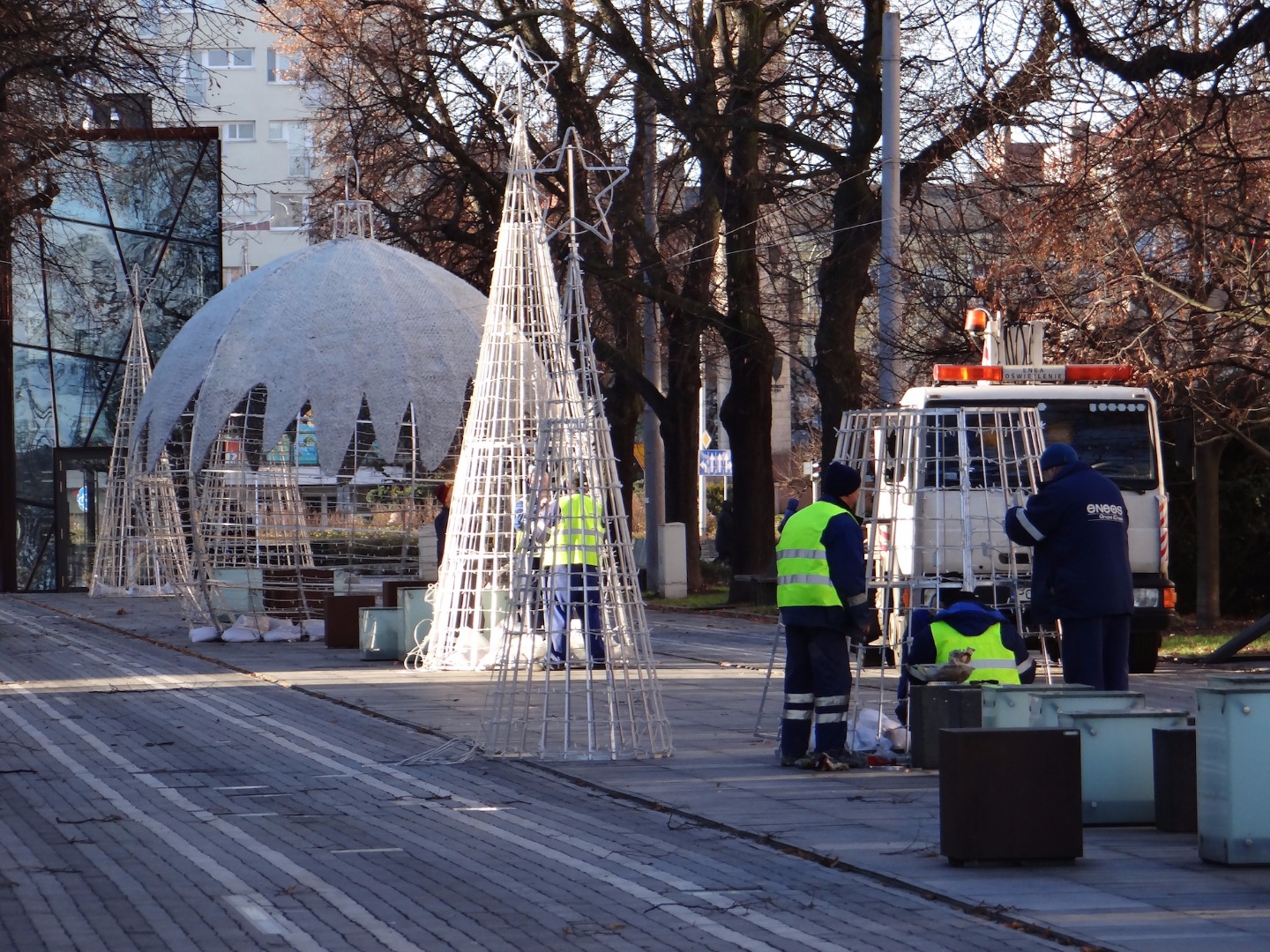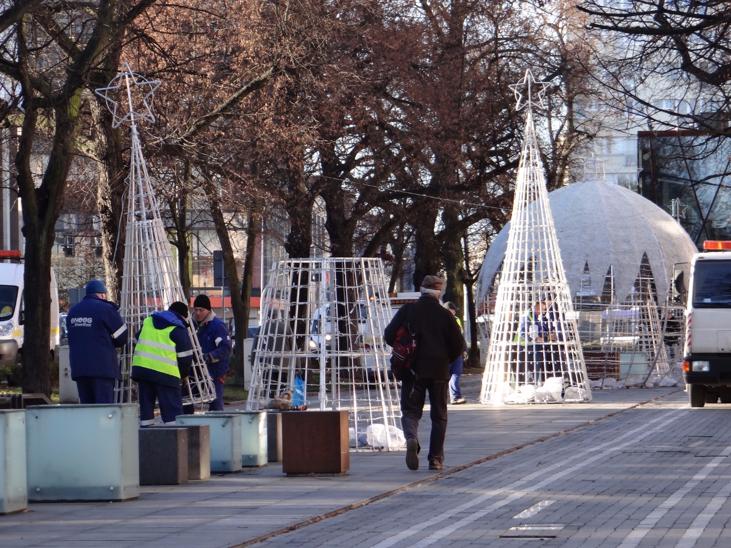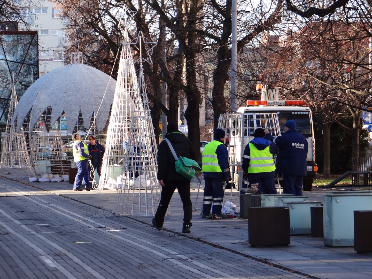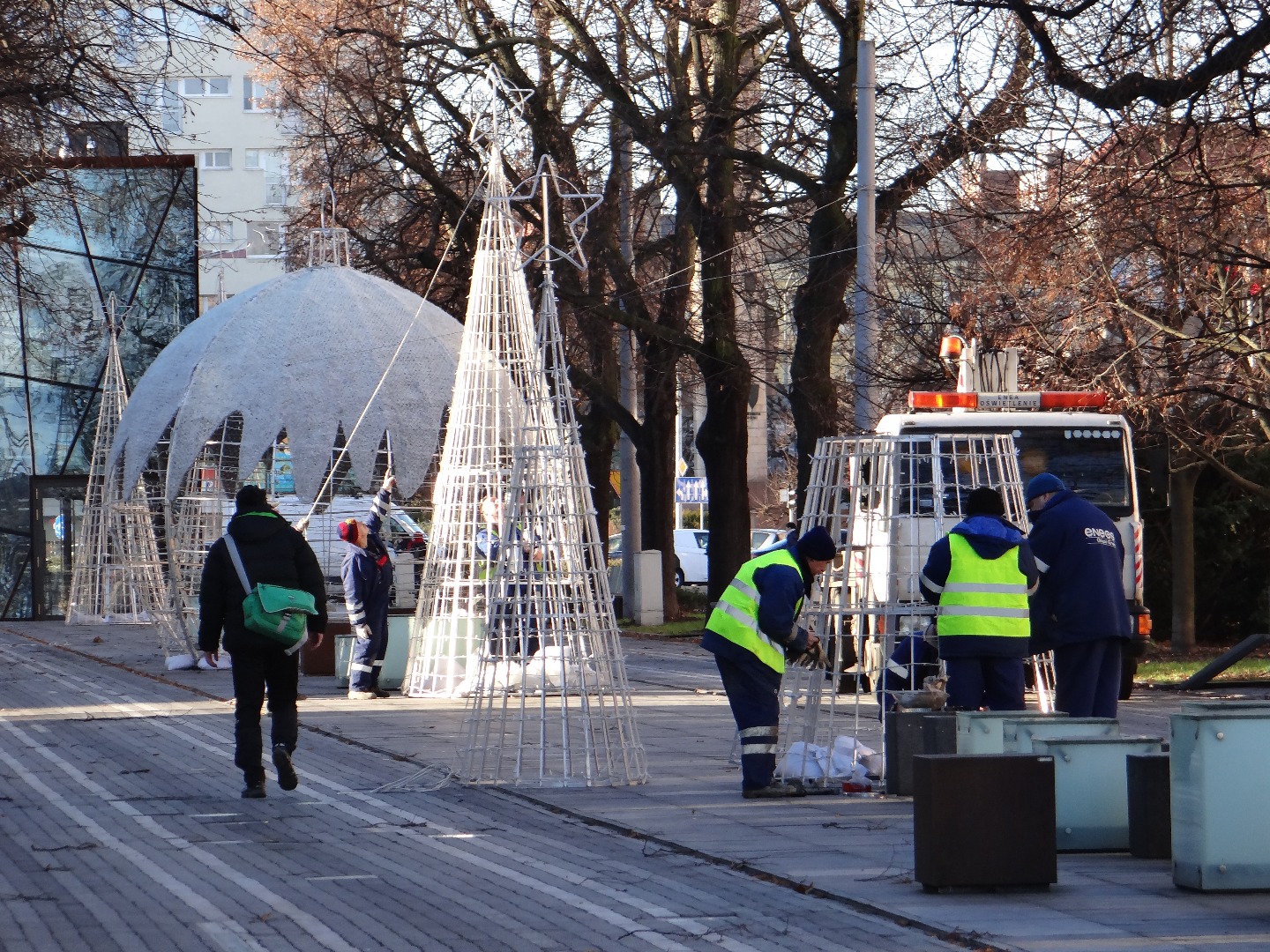W piątek ustawione zostały LED-owe choinki i bombkę na deptaku pl. Żołnierza Polskiego, rozpoczął się też montaż wspomnianej choinki przed magistratem.