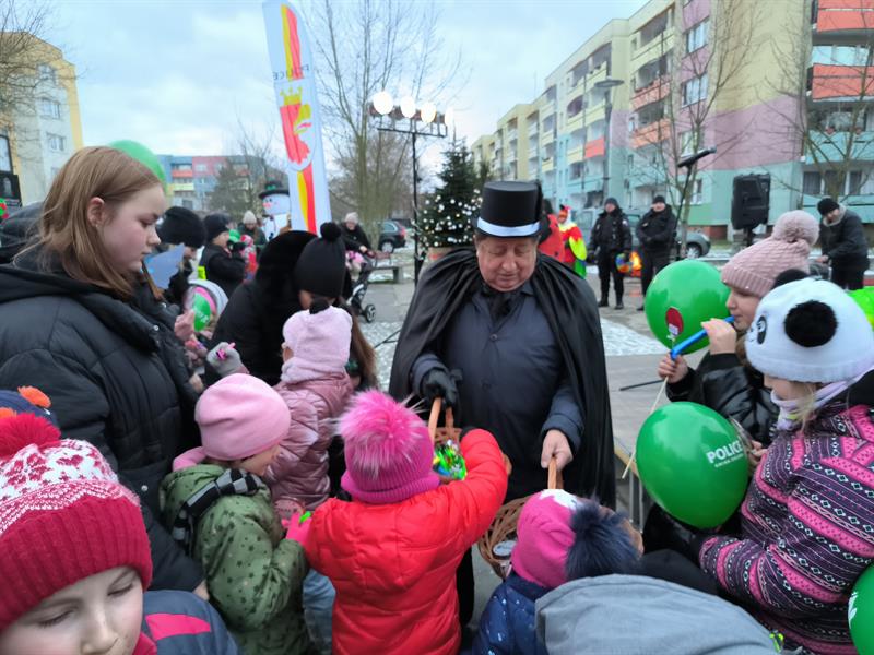 Akcesoria niezbędne do zabawy, czyli coś do hałasowania (piszczałki) i coś dodającego energii w ten dość chłodny wieczór (lizaki), rozdawał burmistrz Polic Władysław Diakun oraz przedstawiciele urzędu i samorządu gminnego.