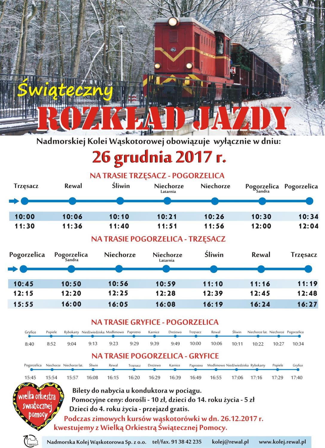 Z atrakcji będą mogli skorzystać i inni, którzy przybędą na Wybrzeże Rewalskie na świąteczny wypoczynek. Zachęcamy do zapoznania się z zamieszczonym szczegółowym rozkładem jazdy. Bilet normalny kosztuje 10 zł, dzieci do 14 lat płacą 5 zł, a poniżej czwartego roku życia – jadą gratis. W trakcie podróży będą zbierane datki na Wielką Orkiestrę Świątecznej Pomocy.