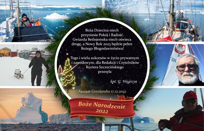Życzenia świąteczne i noworoczne z Grenlandii przesłał na specjalnej kartce kapitan jachtowy Grzegorz Węgrzyn. Przypomnijmy, że podjął on próbę przepłynięcia Northwest Passage jachtem „Regina R. II”. Jednak awaria silnika jednostki podczas sztormu zmusiła go do zawrócenia i przezimowania w grenlandzkiej osadzie Aasiaat.