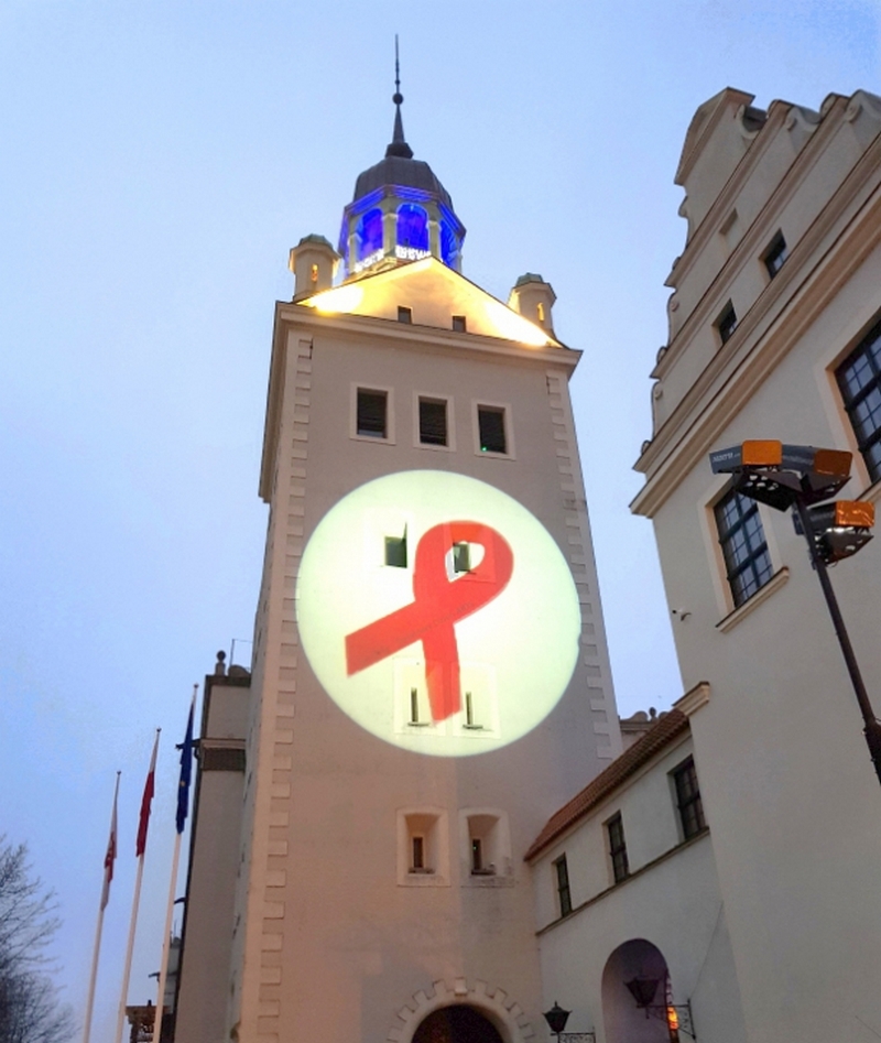 Na zdjęciu: 1 grudnia obchodzony jest Światowy Dzień AIDS. Z tej okazji „Czerwona kokardka” - symbol solidarności z osobami żyjącymi z HIV i AIDS, ich rodzinami i przyjaciółmi - jest w ten weekend wyświetlana na wieży Zamku Książąt Pomorskich w Szczecinie.