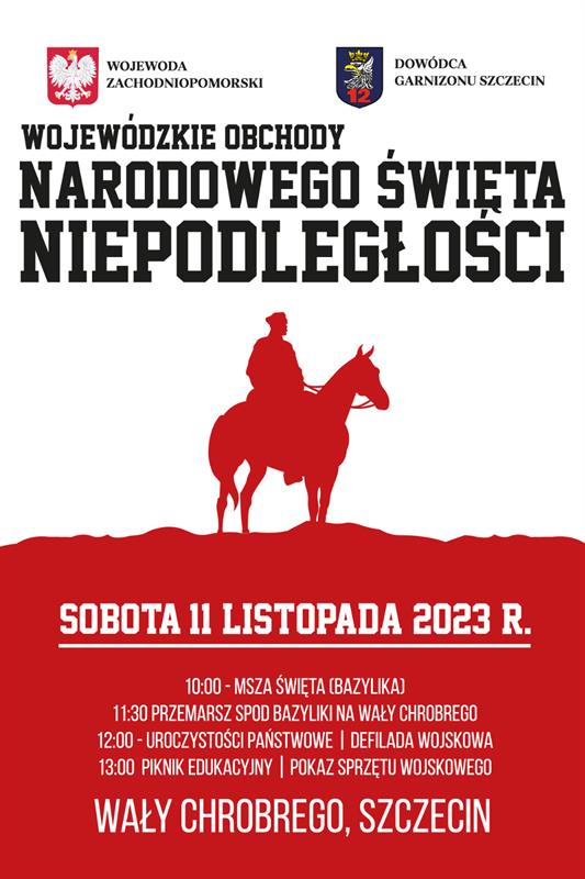 W samo południe przed Zachodniopomorskim Urzędem Wojewódzkim rozpoczną się uroczystości państwowe z udziałem pododdziałów wojskowych 12. Szczecińskiej Dywizji Zmechanizowanej, 14. Zachodniopomorskiej Brygady Obrony Terytorialnej, 8. Flotylli Obrony Wybrzeża, a także strażaków z Komendy Wojewódzkiej PSP, policjantów z Komendy Wojewódzkiej Policji, harcerzy i studentów Politechniki Morskiej w Szczecinie. Zaplanowano m.in. wspólne odśpiewanie hymnu państwowego w ramach akcji „Niepodległa do hymnu”, wręczenie medali i odznaczeń oraz defiladę Wojska Polskiego i służb mundurowych.