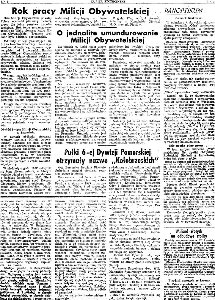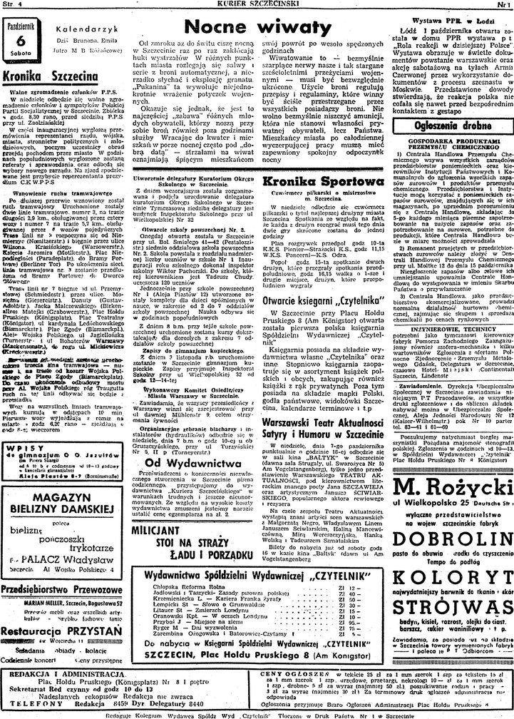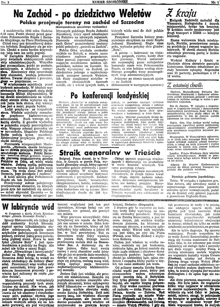 Siedemdziesiąt dziewięć lat temu, z datą 7-8 października 1945 roku, ukazał się pierwszy numer „Kuriera Szczecińskiego”. Gdy nad ruinami miasta unosił się swąd spalenizny, a większość mieszkańców mówiła jeszcze po niemiecku, do rąk nowych mieszkańców, którzy przybywali z różnych części nieistniejącej już de facto – II Rzeczpospolitej, w tym z kresów wschodnich, trafiła gazeta w języku polskim. Nakład numeru wynosił 3 tys. egzemplarzy, a objętość – 4 strony. Gazeta ta kosztowała 2 zł. Pierwszy zespół „Kuriera Szczecińskiego” tworzyli dziennikarze przybyli do Szczecina z Poznania.