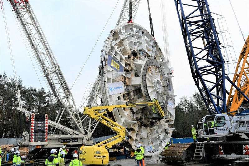 - Większość głównych elementów maszyny TBM została już opuszczona do szybu startowego i jest tam montowana - mówi Piotr Flisiak, dyrektor kontraktu z firmy PORR. - Do opuszczenia tarczy o wadze 280 ton użyto dwóch gigantycznych dźwigów. Zmontowana maszyna TBM będzie ważyć 3120 ton.