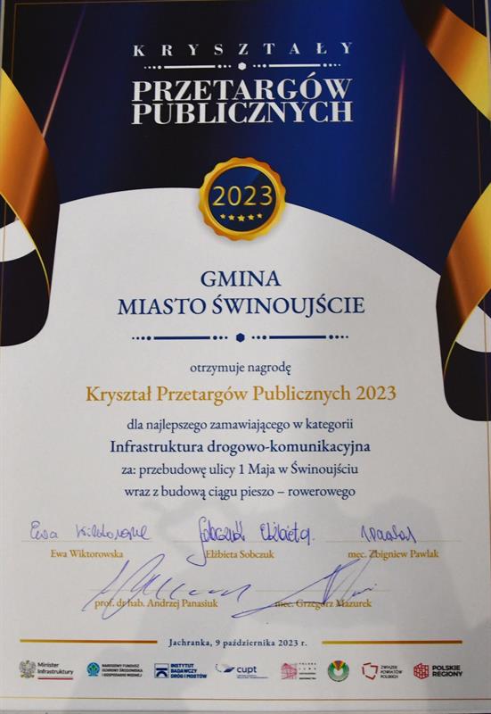 Gmina Miasto Świnoujście otrzymała nagrodę Kryształ Przetargów Publicznych 2023 za najlepszego zamawiającego (inwestora) w kategorii infrastruktura drogowo-komunikacyjna za przebudowę ulicy 1 Maja w Karsiborze wraz z budową ciągu pieszo-rowerowego.