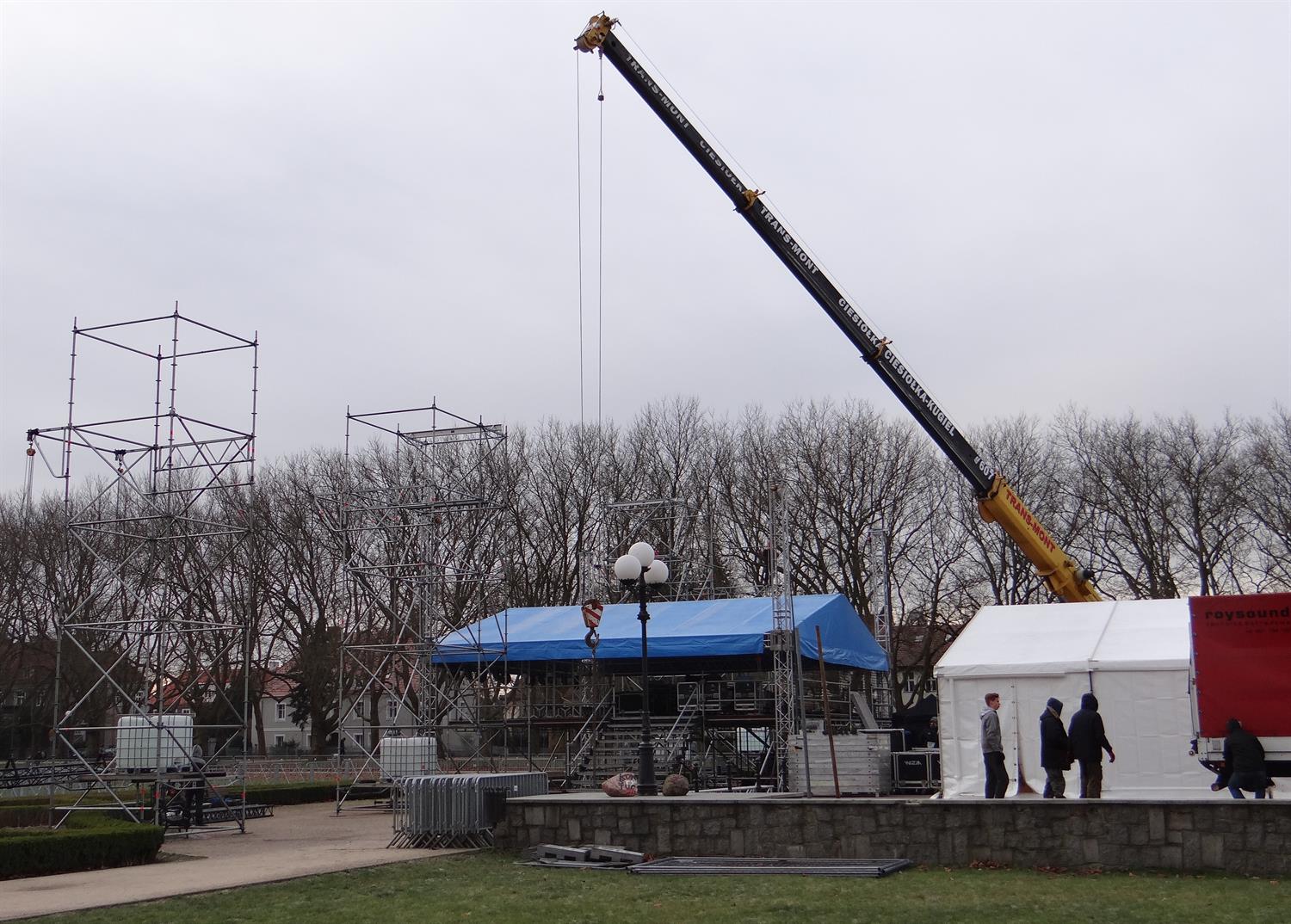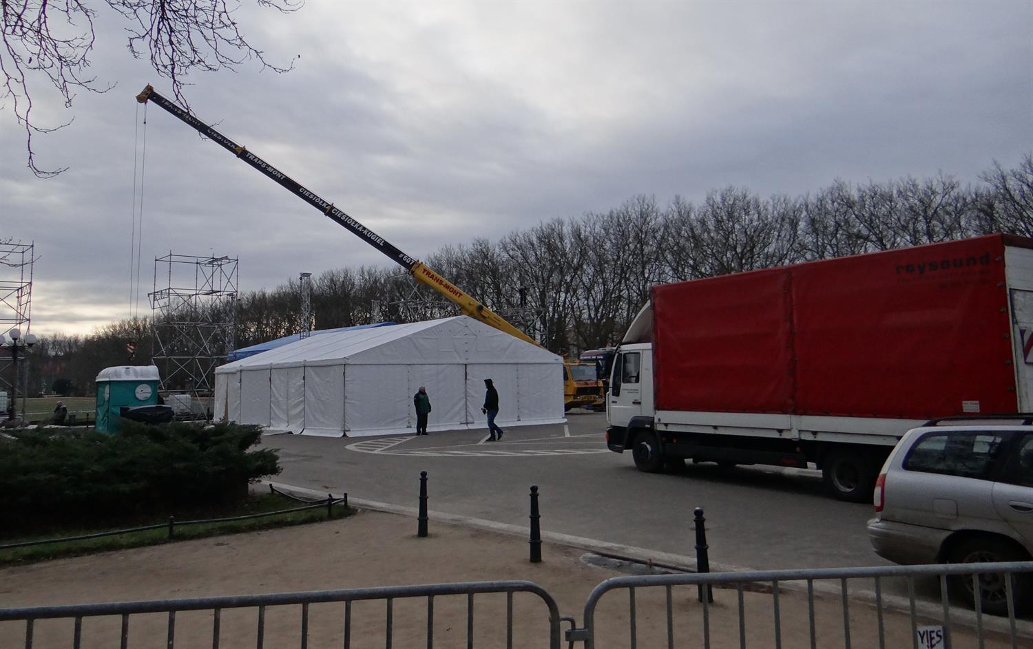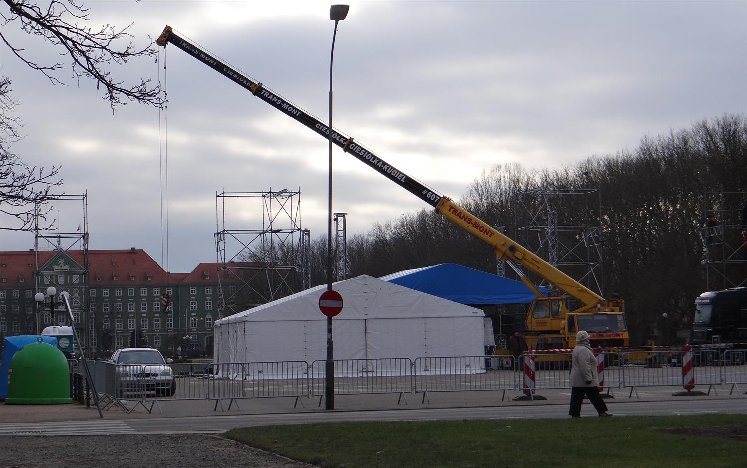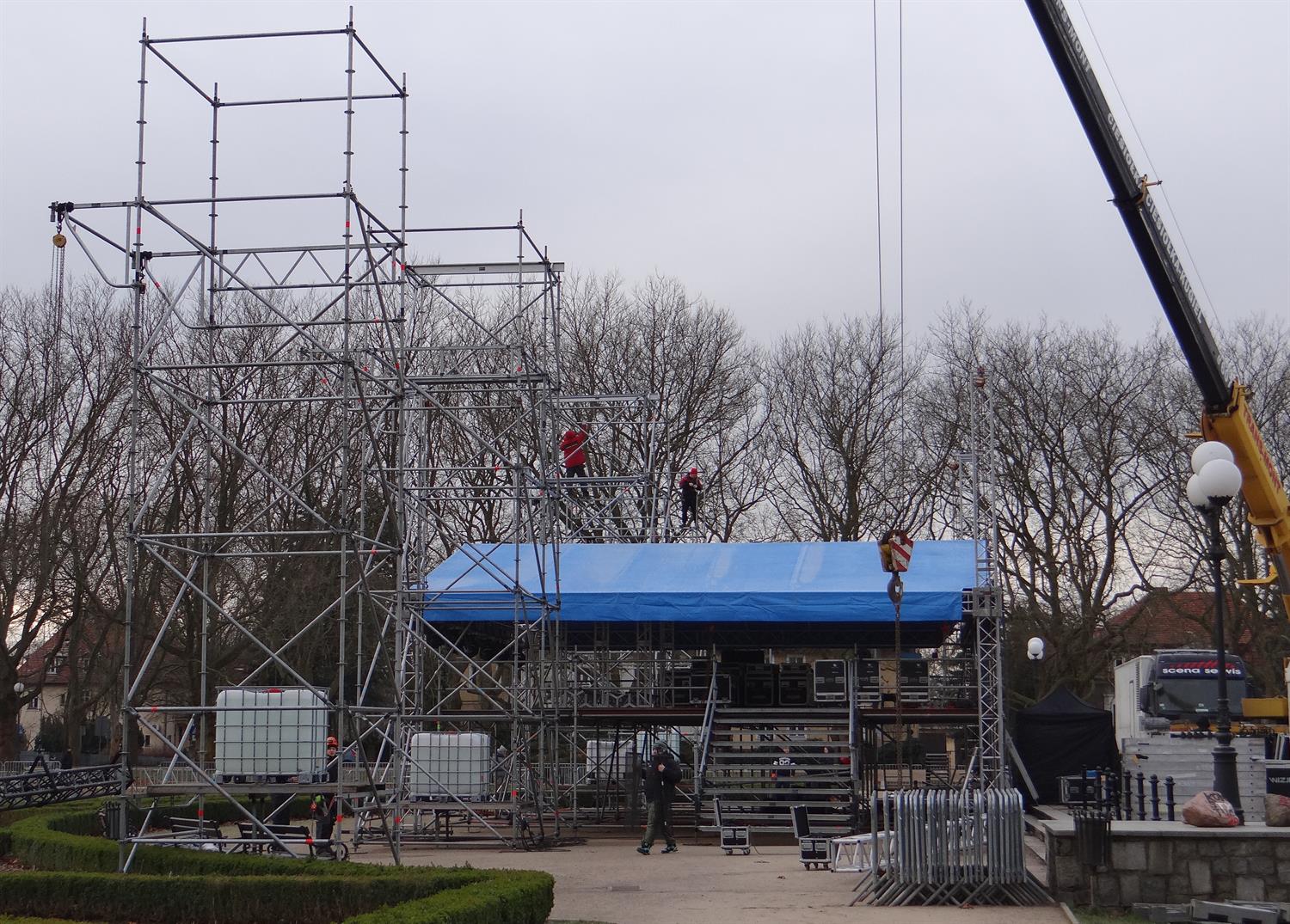 Trwają przygotowania do miejskiej imprezy sylwestrowej na szczecińskich Jasnych Błoniach W sobotę od rana na wygrodzonym barierkami terenie urządzana jest scena. Ustawiane są konstrukcja stalowa i inne elementy estrady. Ta powstaje na parkingu przy ul. Piotra Skargi. Zwożone są i montowane instalacje oświetleniowa i urządzenia do nagłośnienia.