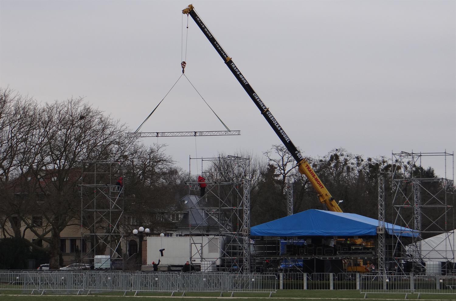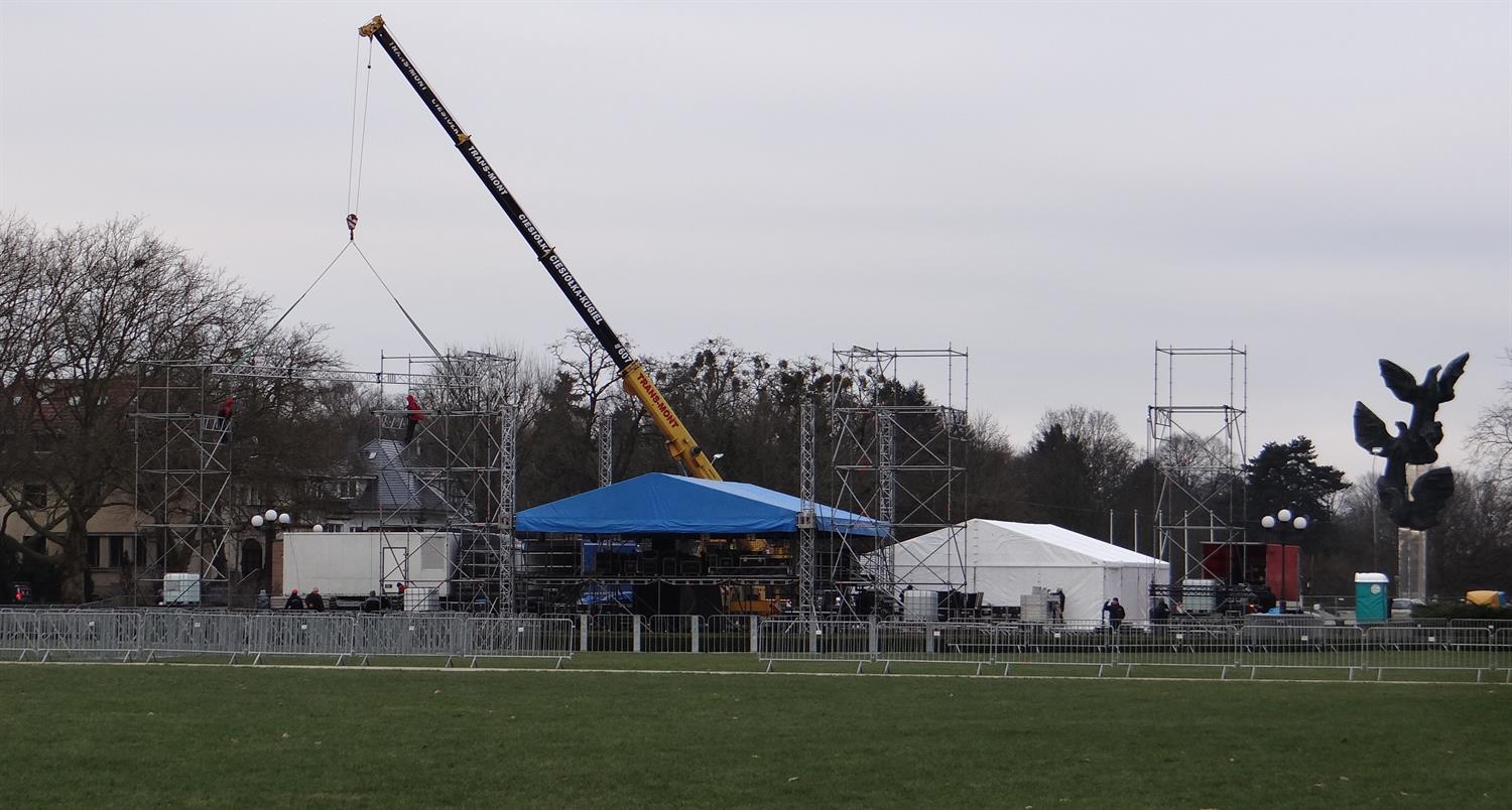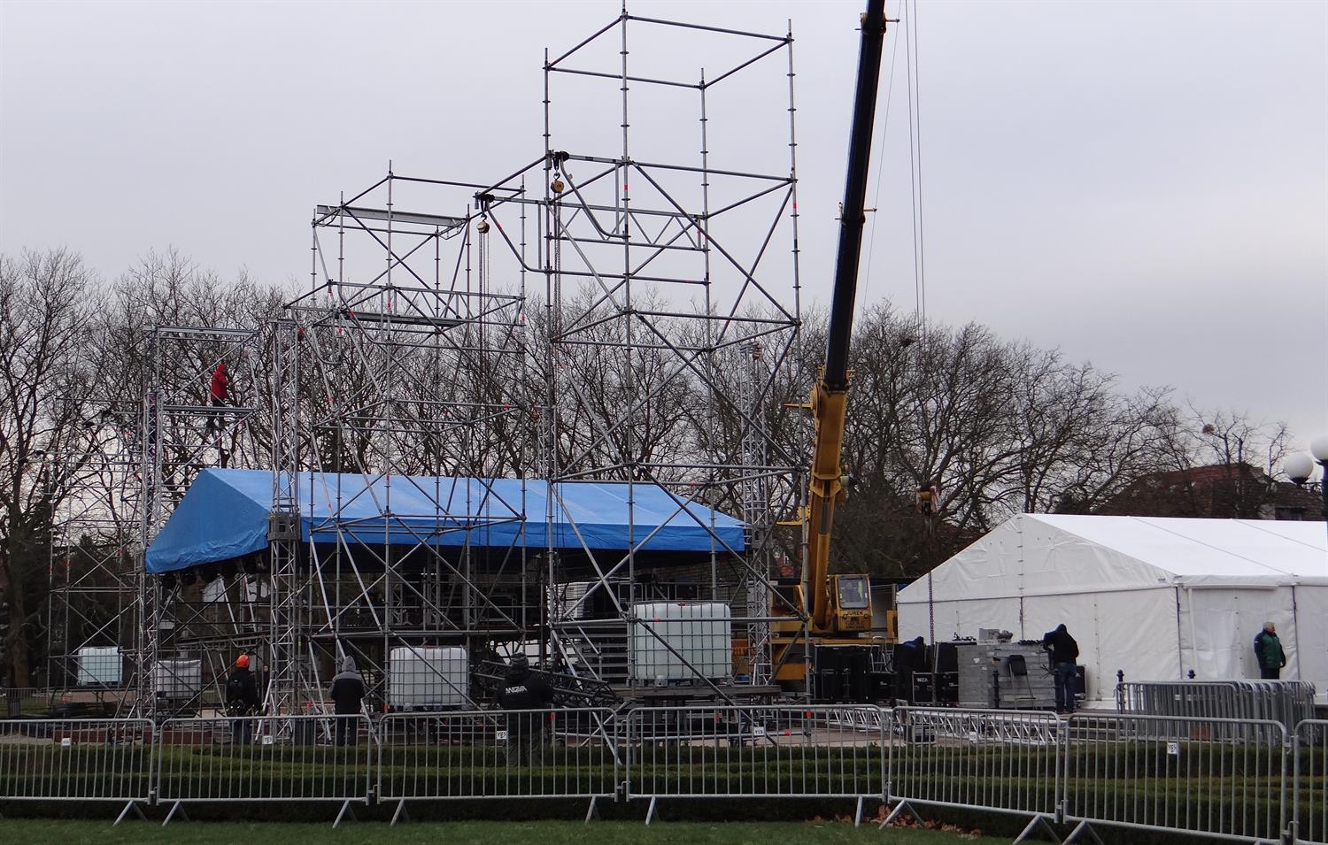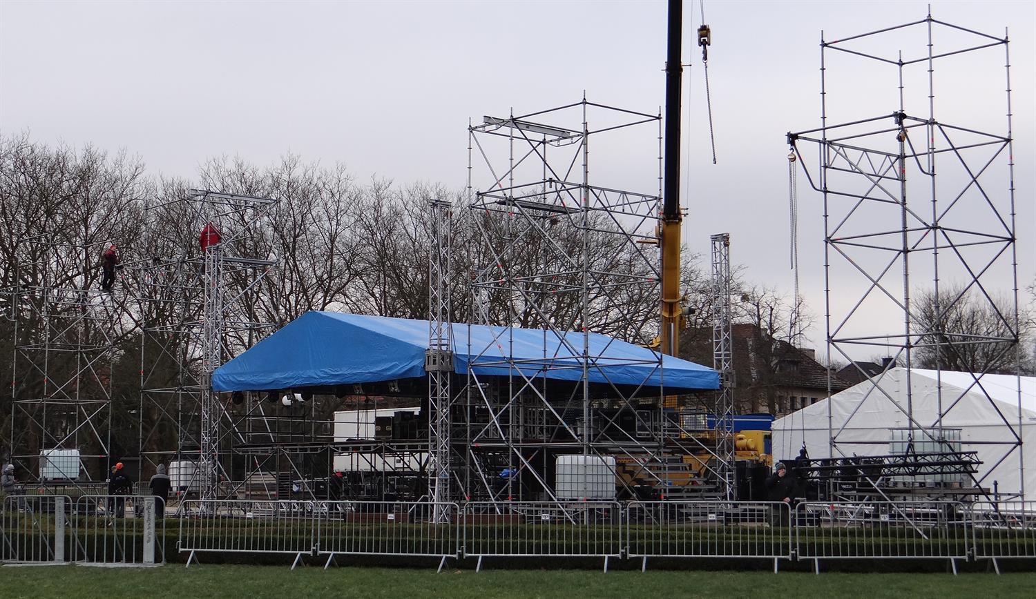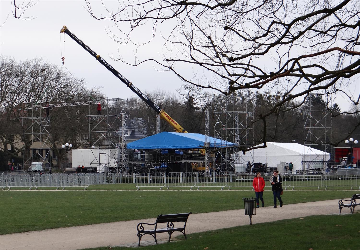 Trwają przygotowania do miejskiej imprezy sylwestrowej na szczecińskich Jasnych Błoniach W sobotę od rana na wygrodzonym barierkami terenie urządzana jest scena. Ustawiane są konstrukcja stalowa i inne elementy estrady. Ta powstaje na parkingu przy ul. Piotra Skargi. Zwożone są i montowane instalacje oświetleniowa i urządzenia do nagłośnienia.