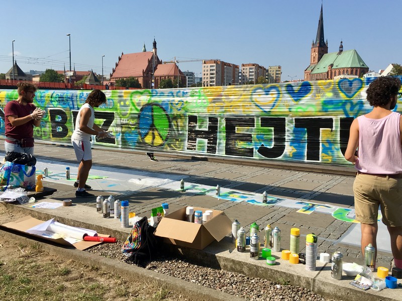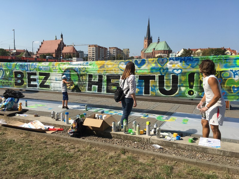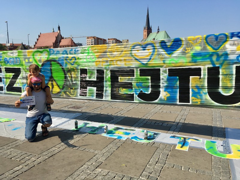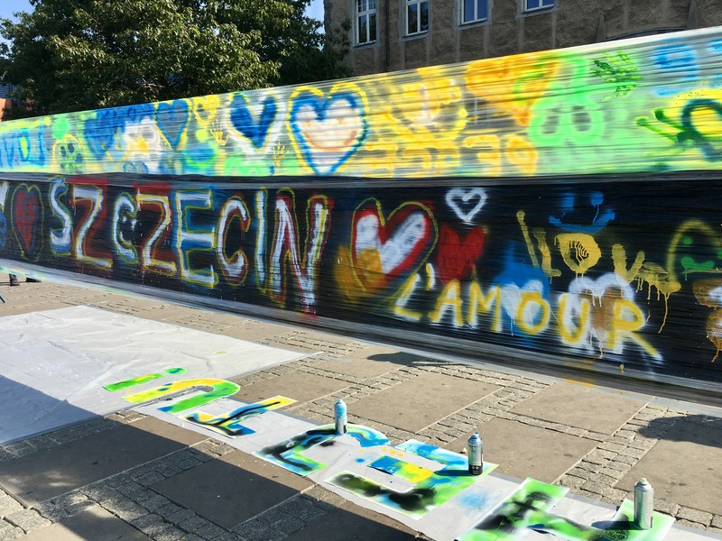 Obraz "Szczecin bez hejtu" zajął ponad 18 m kw. Powstał z 60 puszek farby w sprayu. Jako dzieło wspólne blisko setki społeczników. Jednak przetrwa zaledwie dzień. Potem trafi do jednego ze szczecińskich ekoportów.