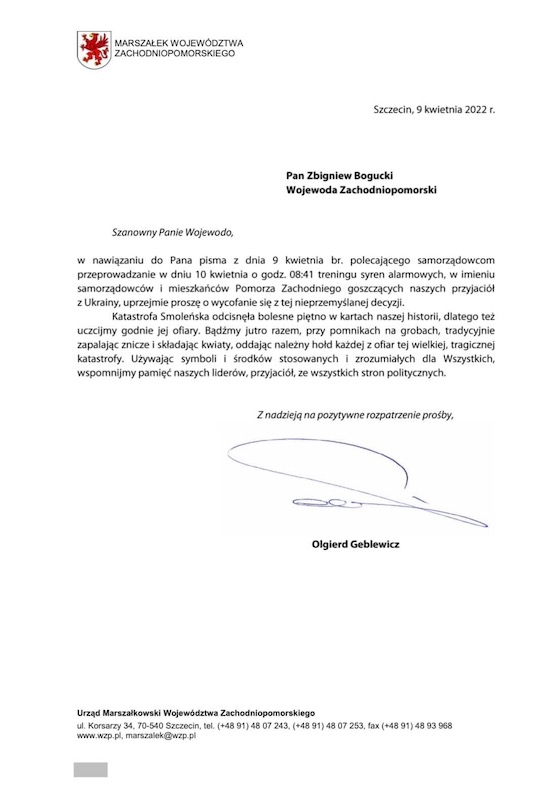 Pismo do wojewody skierował też marszałek województwa Olgierd Geblewicz. W imieniu samorządowców i mieszkańców Pomorza Zachodniego goszczących obywateli Ukrainy prosi o wycofanie się z decyzji o włączeniu syren alarmowych: „Katastrofa Smoleńska odcisnęła bolesne piętno w kartach naszej historii, dlatego też godnie uczcijmy jej ofiary. Bądżmy jutro razem, przy pomnikach, na grobach, tradycyjnie zapaląc znicze i składając kwiaty, oddając należny hołd każdej z ofiar tej wielkiej, tragicznej katastrofy. Używając symboli i środków stosowanych i zrozumiałych dla Wszystkich, wspomnijmy pamięć naszych liderów, przyjaciół, ze wszystkich stron politycznych”.