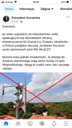 Po niecałej godzinie po wpisie P. Krzystka o poleceniu wojewody, pojawiła się kolejna informacja od prezydenta: "Po wielu sygnałach od mieszkańców, osób opiekujących się obywatelami Ukrainy, stowarzyszenia Mi-Gracja czy Związku Ukraińców w Polsce podjąłem decyzję, że Miasto Szczecin syren alarmowych jutro NIE WŁĄCZY. Musicie mieć jednak świadomość, że dostęp do systemu alarmowego mają także służby Urzędu Wojewódzkiego. Mogą to zrobić sami, bez naszego udziału".
