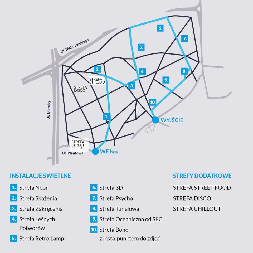 Zwieńczeniem wieczornego spaceru powinien się stać park Żeromskiego, gdzie szczecinian i turystów czeka aż dziesięć świetlnych stref! Będą tu podświetlone korony drzew, lampy w stylu retro, strefa leśnych potworów, a nawet strefa boho z instagramowym punktem do robienia zdjęć. Najefektowniejsze iluminacje to nie wszystko, co czeka nas w parku. Za sprawą rozświetlonych drogowskazów będzie można dotrzeć do ukrytej między drzewami dyskoteki pod gołym niebem oraz wypocząć na leżakach w strefie chillout. Dodatkowo na odcinku ul. Plantowej powstanie strefa Street Food z food truckami z pysznym jedzeniem.