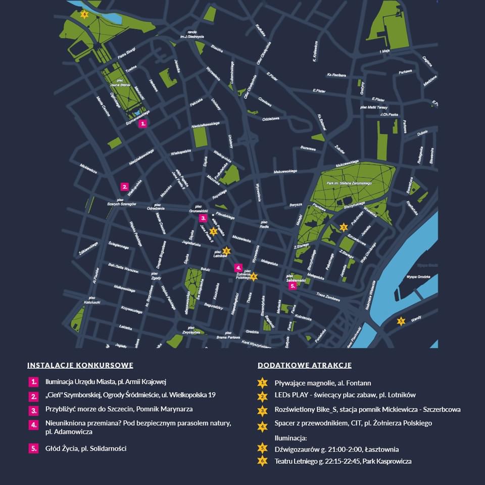 To tylko jedna propozycja takiej wędrówki śladem iluminacji i instalacji, ale można skorzystać z innej trasy i wieczorny spacer rozpocząć od Teatru Letniego, który także rozbłyśnie tysiącami kolorów. Miłośnicy turystyki rowerowej mogą śladem iluminacji podążać na dwóch kółkach – od godziny 21 będzie można wypożyczyć 10 specjalnie rozświetlonych rowerów miejskich. Lokalizacja: Stacja Bike_S: pomnik Adama Mickiewicza przy ul. Szczerbcowej. Zwiedzanie rozświetlonego miasta można także zacząć od nadodrzańskich bulwarów – z nich podziwiać kolorowe żurawie portowe, czyli dźwigozaury.