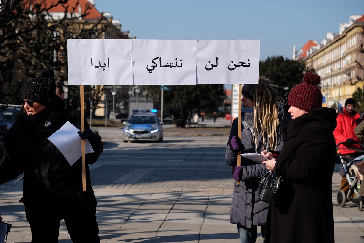 Podczas manifestacji pojawił się również transparent z hasłem zapisanym w języku arabskim.