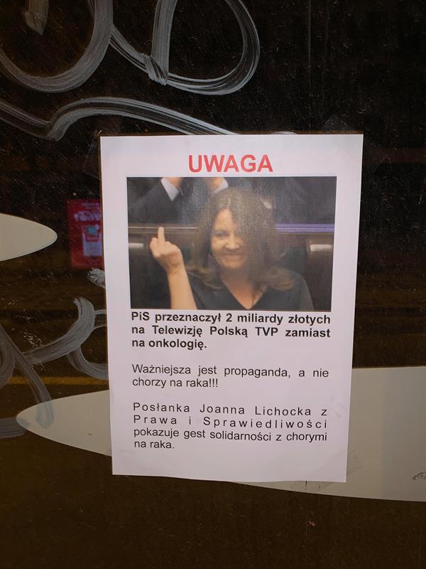 lichocka faktycznie żle zrobiła zniżyła się do poziomu cyników z PO.Grodzki zagrał chorymi na raka ., wykorzystał ich do walki politycznej( bo te 2 mld byłyby niewidoczne w leczeniu).Dzisiaj w radio tok fm najsztub się zastanawiał czy ten gest będzie widoczny do kampanii wyborczej.Jako kibic sportowy w publicznej mam duzo transmisji i tvp sport odkodowany , za brauna nie było transmisji a mśw w siatkówce które odbywały się w POlsce oglądali tylko posiadacze dekoderów polsatu dodatkowo w płatne 100 zł oczywiście nie było LM, ekstraklasy , reprezentacji Polski w różnych dyscyplinach drużynowych.Były tylko skoki narciarskie.Prezentując takie plakaty twórcy licza na to, że wyborca to zwykły tłuk który wszystko widzi biało czarno .