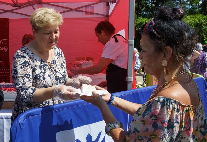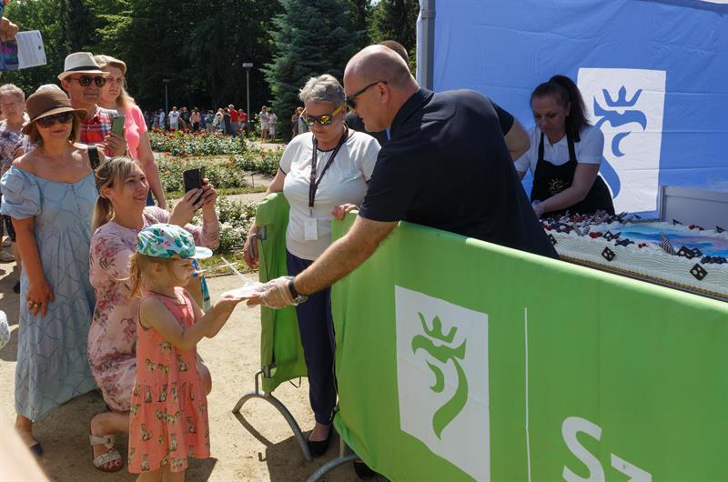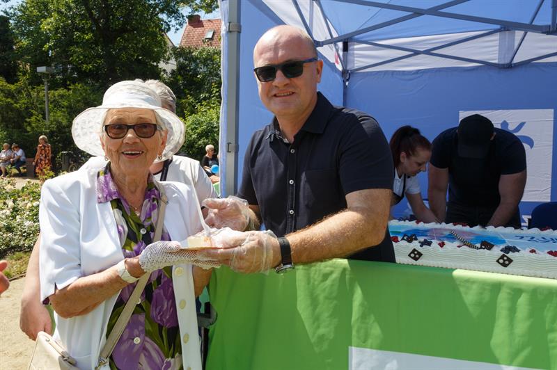 W kolejce po tort ustawiały się całe rodziny. Choć zarówno prezydent, jak i przewodnicząca Rady Miasta mieli wsparcie od osób, które kroiły torty i nakładały na tacki, to Piotr Krzystek miał najwięcej pracy. Przy „jego" namiocie kolejka posuwała się wolniej. Wiele osób, bez względu na wiek, starało się bowiem, by nie tylko dostać tort właśnie z rąk prezydenta, ale by uwiecznić to na „selfie", lub by zdjęcie wykonał ktoś z rodziny.