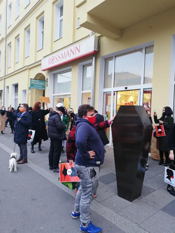 W sumie blisko 200 osób: ubranych na czarno lub z parasolkami w tym kolorze. Z wieszakami, czyli nieformalnymi symbolami piekła kobiet. Z transparentami, których hasła mówiły o "dyktaturze religijnych fanatyków", "Trybunale działającym na polityczne zlecenie", a też : "Rewolucja jest kobietą", "W Polsce to polityk i klecha kontroluje życie kobiety", "Ratujmy kobiety". Natomiast wbrew jednemu z haseł - "Nie czas palić znicze. Czas się wkurwić!" - stojący w kolejce zapalili znicze. U wejścia do biura poselskiego PiS. Odbył się też symboliczny "pogrzeb praw kobiet" - z użytą w owym happeningu czarną trumną.