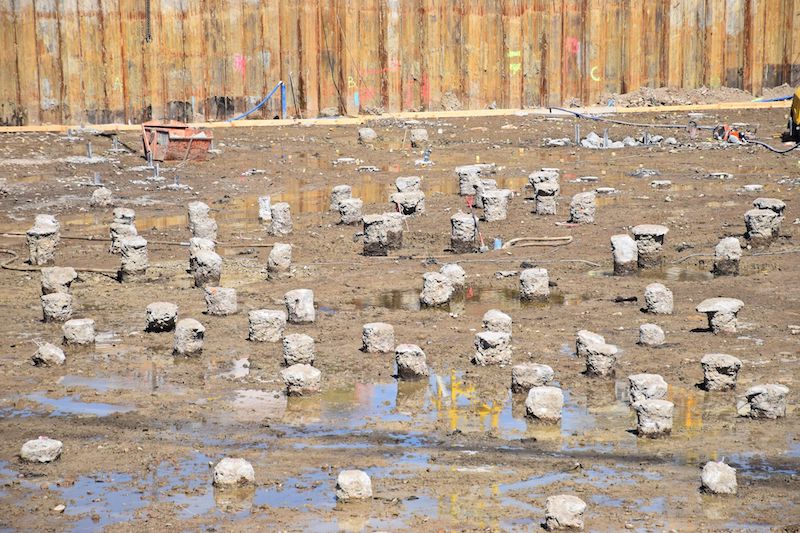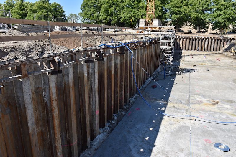 Kilkumetrowy wykop przyszłego budynku basenowego jest prawie gotowy na kolejny etap prac. Zakończone zostało palowanie, co oznacza, że w najbliższym czasie rozpocznie się wylewanie betonowej płyty fundamentowej.