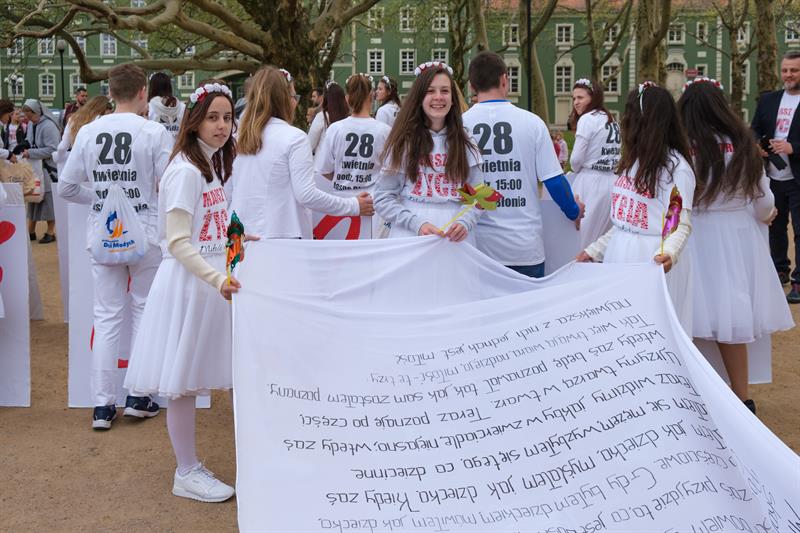 Pod pomnikiem Św. Jana Pawła II rosła zaś sterta pieluch, które przynoszono dla wsparcia matek w potrzebie oraz Domu Samotnej Matki w Poczerninie. Zbierano też datki do puszek na ten dom, a w zamian rozdawano gadżety, jak koszulki, kubki czy znaczki stópek nienarodzonego dziecka w 11. tygodniu życia. Można było otrzymać też rozmaite flagi (było wiele biało-czerwonych, ale widzieliśmy sporo ukraińskich), sztandary i transparenty. Niesiono też przepisaną przez uczniów encyklikę papieża Benedykta XVI „Deus caritas est". Trudno nam było ocenić jej długość, ale gdy czoło transparentu niesionego przez bardzo wielu maszerujących docierało do ul. Jagiellońskiej, to koniec był jeszcze przy ul. Wielkopolskiej...