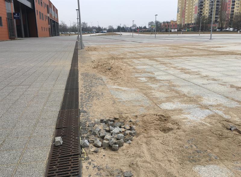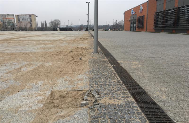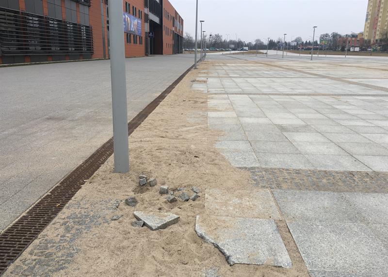 Piach można by uprzątnąć szybko. Wystarczy chcieć. A trzeba to zrobić jak najszybciej, czyli zanim piach spłynie wraz z opadami do kanałów odprowadzających deszczówkę z rozległego placu przy Arenie do miejskiej kanalizacji. Gorzej ze szkodami, poczynionymi w nawierzchni. Sporo płyt zostało połamanych, gdy inne wgniecione w grunt. Odcinki wyłożone małą granitową kostką w wielu miejscach został naruszone. Całość trzeba będzie przełożyć, nawierzchnię wyrównać. Czyli naprawić szkody, które teraz - przez zaniedbanie - kłują w oczy szczecinian.