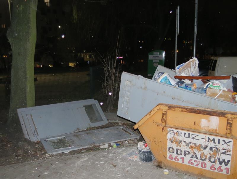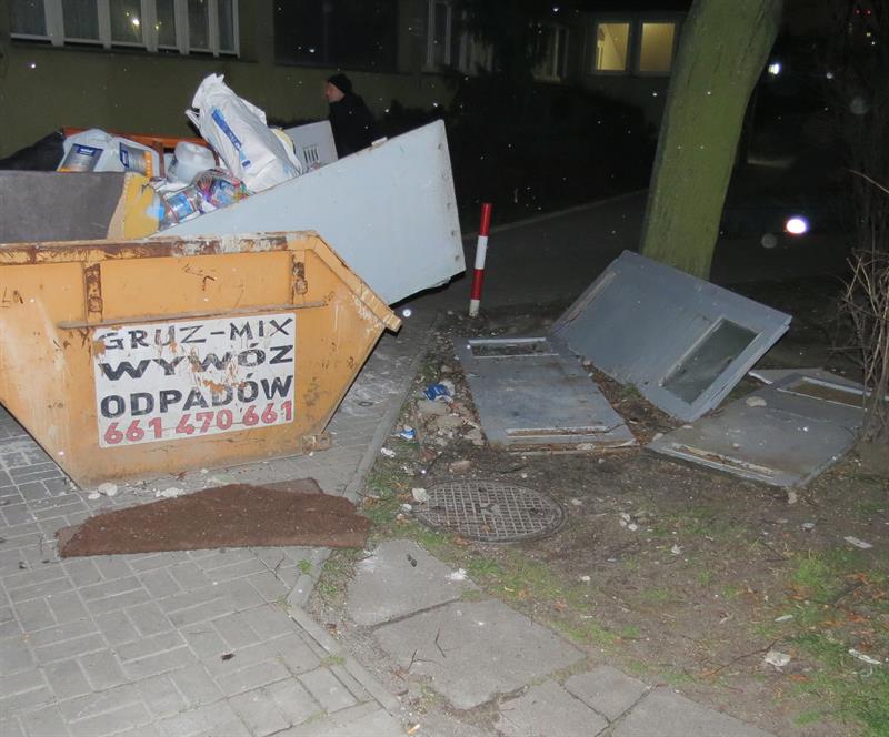 Skrzydła drzwiowe porzucone przy kontenerze na odpady. Jedne przygniatają pień drzewa. Innymi już połamano krzewy. To obrazek sprzed budynku przy ul. Ofiar Oświęcimia 16, przekazany przez Czytelnika z następującym komentarzem:
