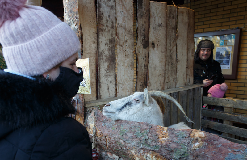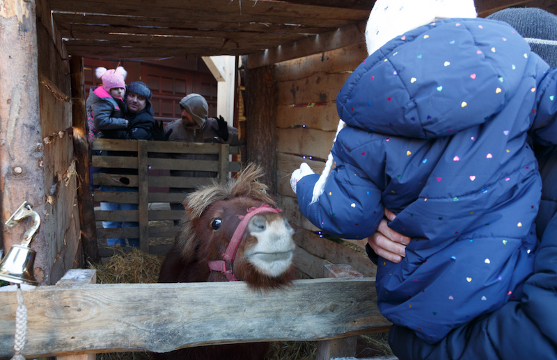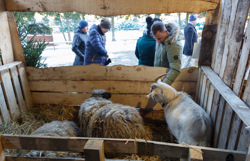 W zagródkach zbitych z desek, przy stajence, kicają króliki, a w poboczu żłóbka z osiatkowanej półki gruchają gołębie królewskie. Zwierzęce stadko uzupełniają kucyk, gęsi i kury, koziołek matołek i trzy owce o wdzięcznych imionach Zela, Mela i Giza.