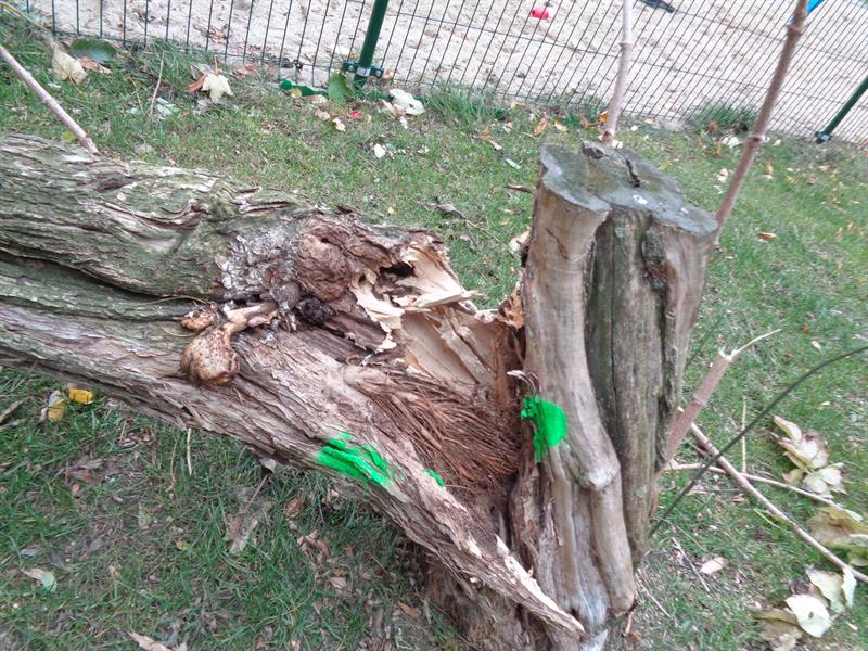 Do zdjęcia: Krok od nieszczęścia, czyli spróchniałe drzewo obaliło się przy piaskownicy ogródka jordanowskiego przy ul. Farnej. "Ktoś musi ponieść przynajmniej koszty naprawy ogrodzenia" - zdarzenie komentuje Małgorzata Zychowicz-Prus, przewodnicząca RO Stare Miasto.