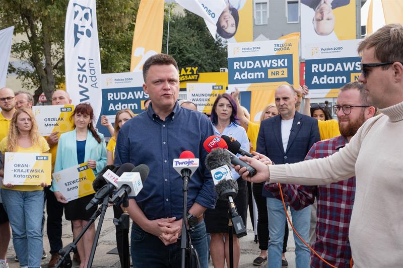 "Prawo i Sprawiedliwość ma więcej banerów, ale coraz mniej miejsca w ludzkich sercach" - powiedział we wtorek w Szczecinie Szymon Hołownia, lider Polski 2050. Jego zdaniem 15 października liberalno-lewicowa opozycja odsunie PiS od władzy i stworzy wspólny rząd. Ogłosił, że kandydaci na posłów z Trzeciej Drogi - czyli wspólnego projektu Polski 2050 oraz Polskiego Stronnictwa Ludowego - "staną na głowie", aby polskie sprawy z powrotem "postawić na nogi".