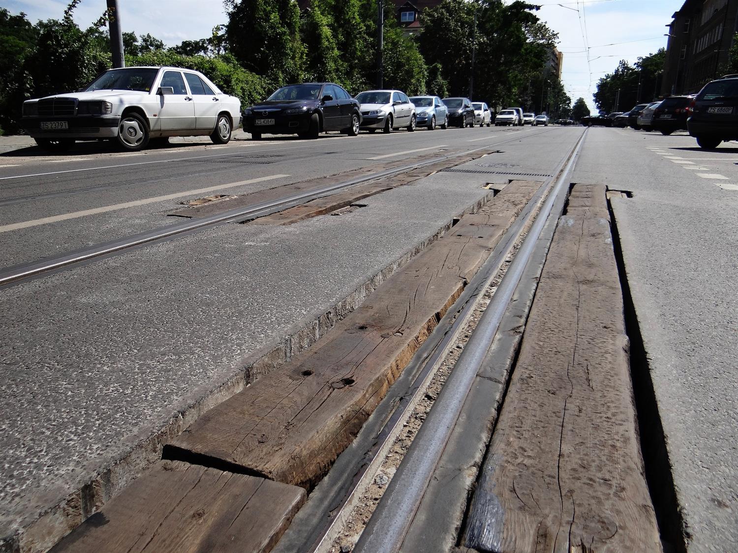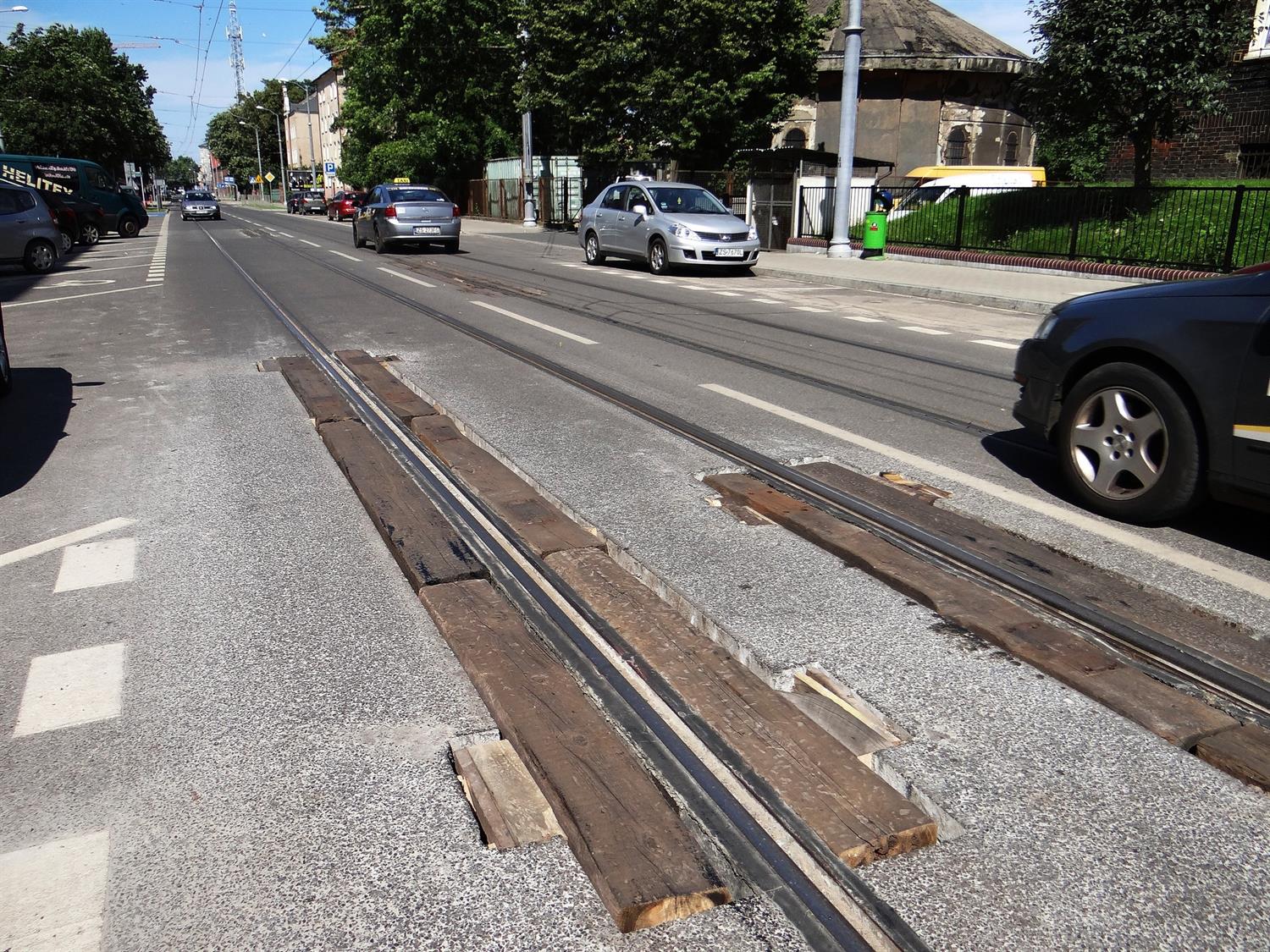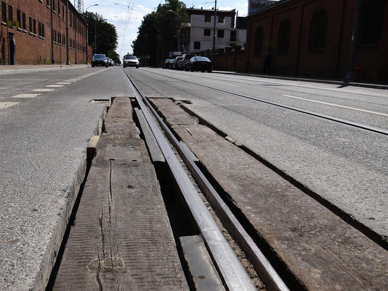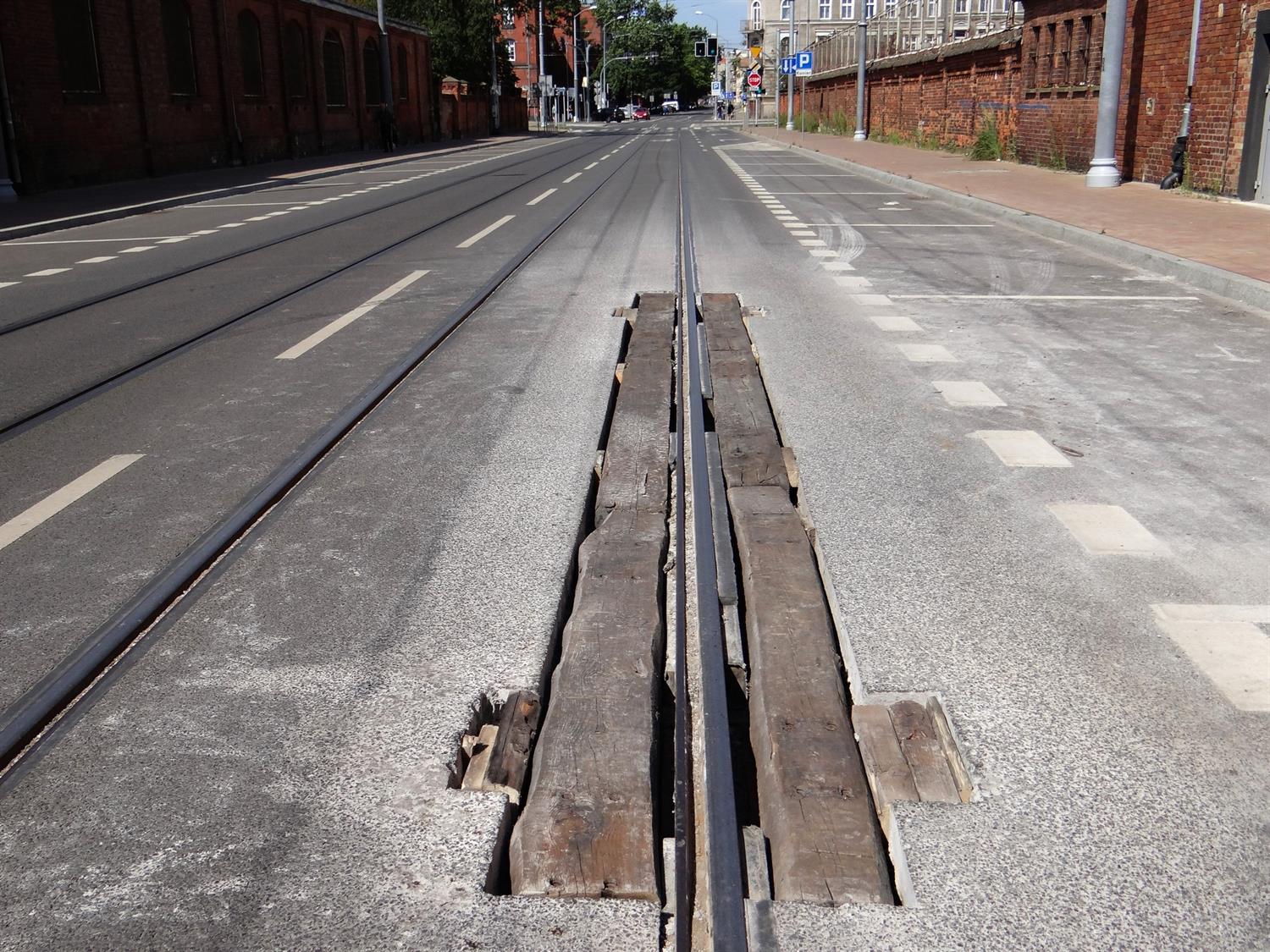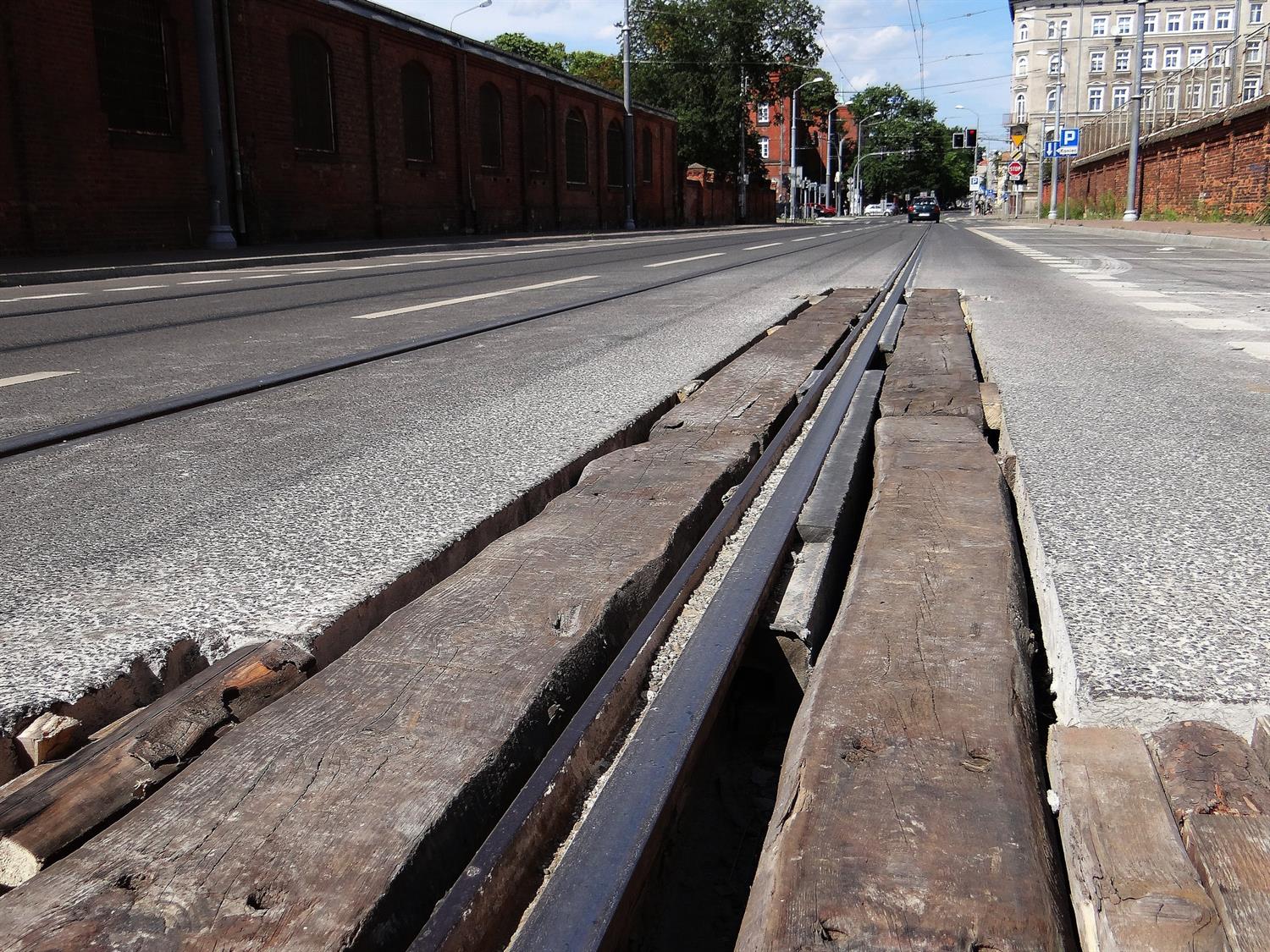 W wykutych fragmentach nawierzchni po obu stronach szyn obu torów ułożone zostały tymczasowo – na czas koniecznych napraw – wypełnienia z drewnianych belek, w tym starych podkładów.