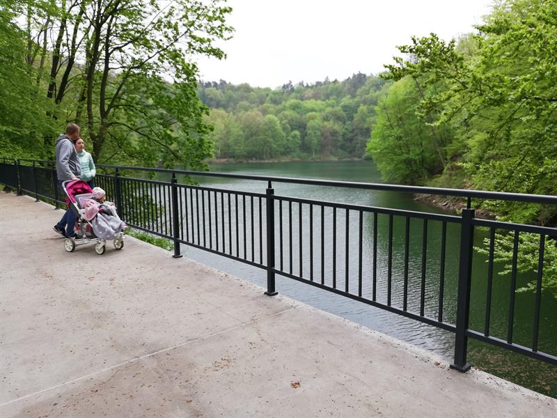 Charakterystyczny mostek nad jez. Szmaragdowym - jak i ono samo - to pozostałość po istniejącej w tym miejscu kopalni kredy, eksploatowanej na rzecz pobliskiej cementowni „Stern" (1880 r.). Samo jezioro to efekt katastrofy - w lipcu 1925 r. wyrobisko zostało zalane wodą, która runęła nań z południowej ściany. Stąd na jego dnie wciąż tkwią pozostałości górniczych maszyn i urządzeń. Natomiast charakterystyczny mostek nad taflą wody - jeden z najlepszych punktów widokowych tej części Szczecińskiego Parku Krajobrazowego „Puszcza Bukowa” - to tak naprawdę betonowy wiadukt kolejki kopalnianej, którą wywożono urobek kredy do cementowni.