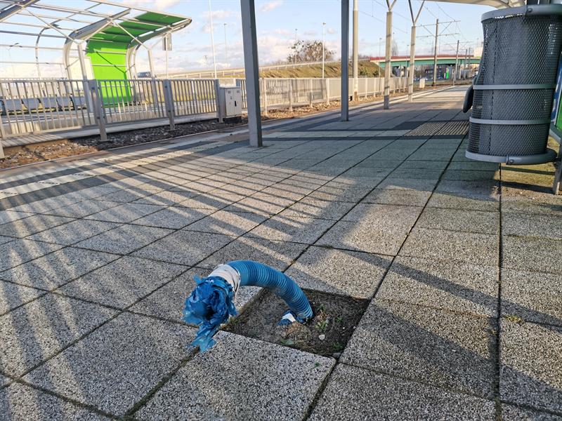 Przystanek tramwajowy przy ul. Hangarowej. Od dłuższego czasu z ziemi wystaje tu niebieska rura, której zadaniem jest… No właśnie! O co chodzi z tym tajemniczym kawałkiem rury, która niczym niezabezpieczona wystaje z ziemi w miejscu przeznaczonym dla oczekujących na tramwaj pasażerów? Najdziwniejsze jest jednak nie to, że nie wiadomo czemu ma służyć, tylko to, że tkwi w tym miejscu i nic się nie dzieje. Pasażerowie oczekujący na przystanku głośno o niej dyskutują i są przekonani, że fachowcy o niej po prostu zapomnieli. Aż dziw bierze, że żadna łobuzeria do tej pory tej rury nie zniszczyła…
