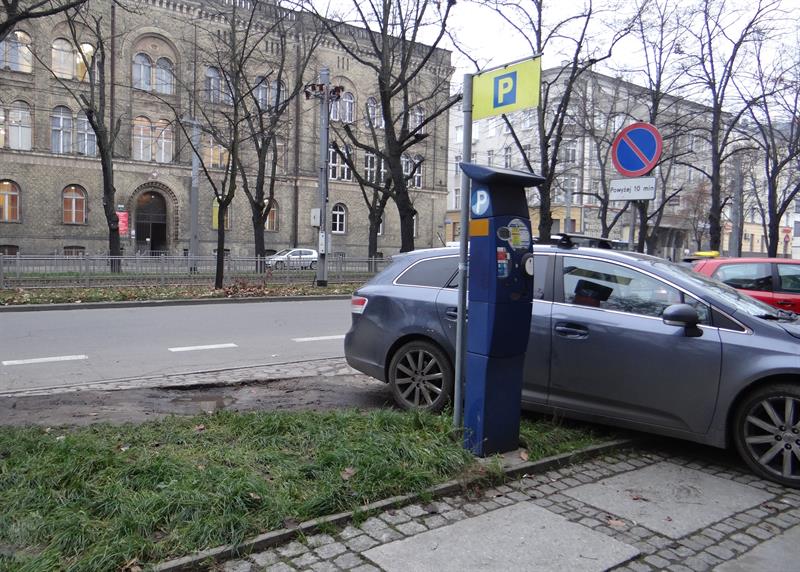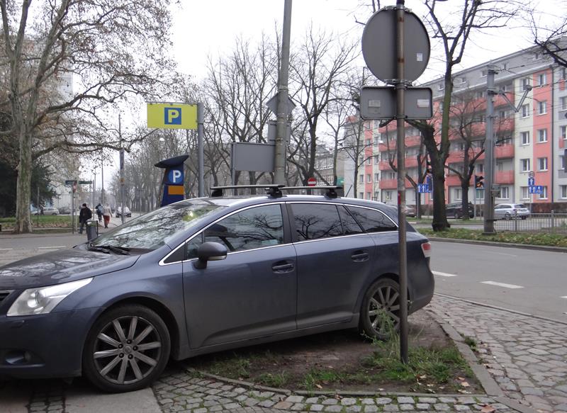 Uznał, że nie dla niego poszukiwania miejsca na parkingu, skoro może rozjechać trawnik i zająć zarówno pas zieleni, jak i chodnika. Bezkarnie. W końcu to „tylko" al. 3 Maja, a nie np. ul. Klonowica, Strzałowska czy Struga, gdzie mieszczą się siedziby oddziałów szczecińskiej Straży Miejskiej.