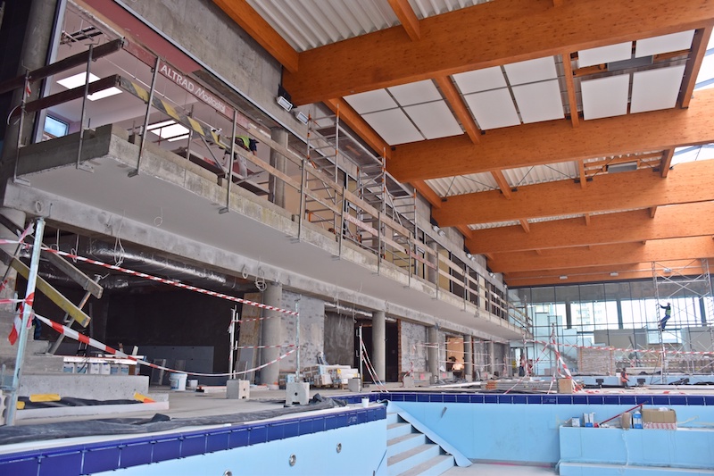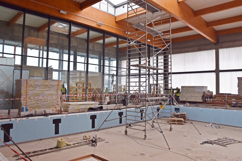 - W holu wejściowym zainstalowane jest przeszklenie oddzielające hol od części basenowej. Na suficie montowane są panele akustyczne. Realizowane są też prace przy montażu obudowy świetlika. Z kolei w części zewnętrznej obiektu, realizowane są roboty przygotowawcze pod budowę dróg dojazdowych i parkingu - dodaje Piotr Zieliński.