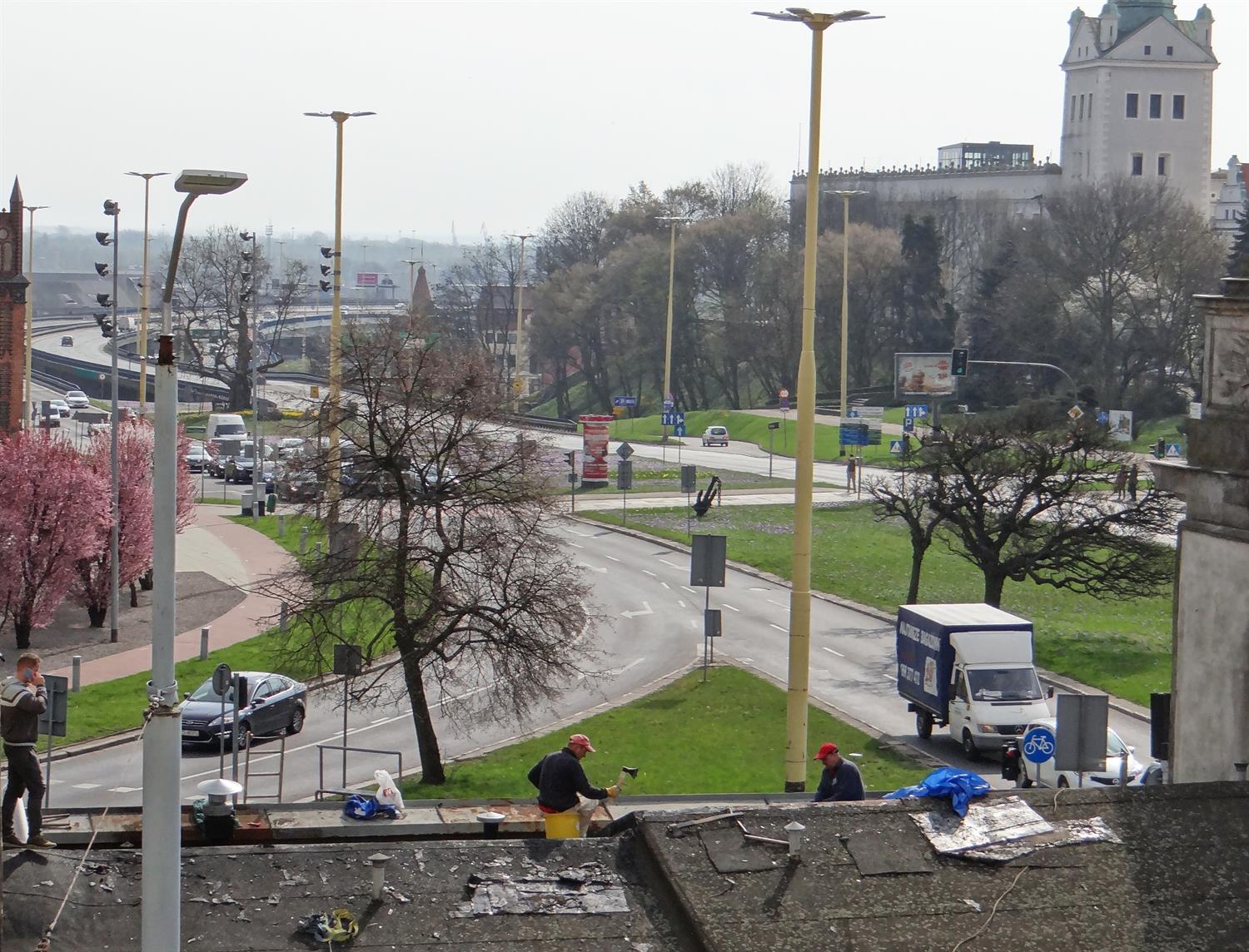 Tak zwani fachowcy. Dwaj z siekierami w rękach. Jeden - z komórką. Wszyscy na dachu zabytkowej Bramy Królewskiej, czyli na wysokościach, choć bez ubrań roboczych, kasków, jakichkolwiek zabezpieczeń. Za to z widokiem… między innymi na Zamek Książąt Pomorskich oraz Komendę Wojewódzką Policji. Tak - jak widać na zdjęciu - się robi w Szczecinie, zachowując w „nadzwyczajnej dyskrecji" zasady bezpieczeństwa i higieny pracy. Tak też się sprawuje pieczę nad zabytkiem. Czyli: jak pozwalają i jak się chce. Niestety...