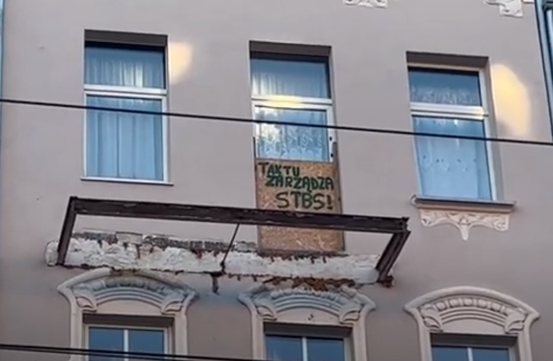 Jeden z mieszkańców kamienicy przy ul. Jagiellońskiej w Szczecinie miał już dość oczekiwania na przywrócenie balkonu zdemontowanego na zewnątrz swojego mieszkania. Na płycie wiórowej, którą zasłonięte zostało wyjścia na nieistniejący balkon, umieścił więc napis "TAK TU ZARZĄDZA STBS!".