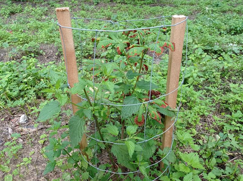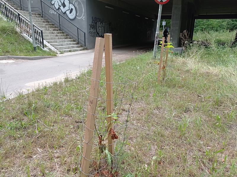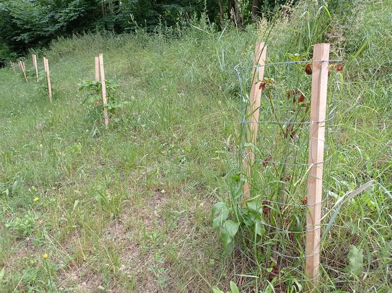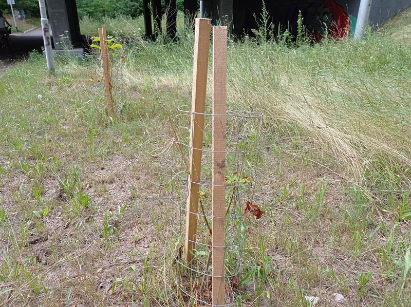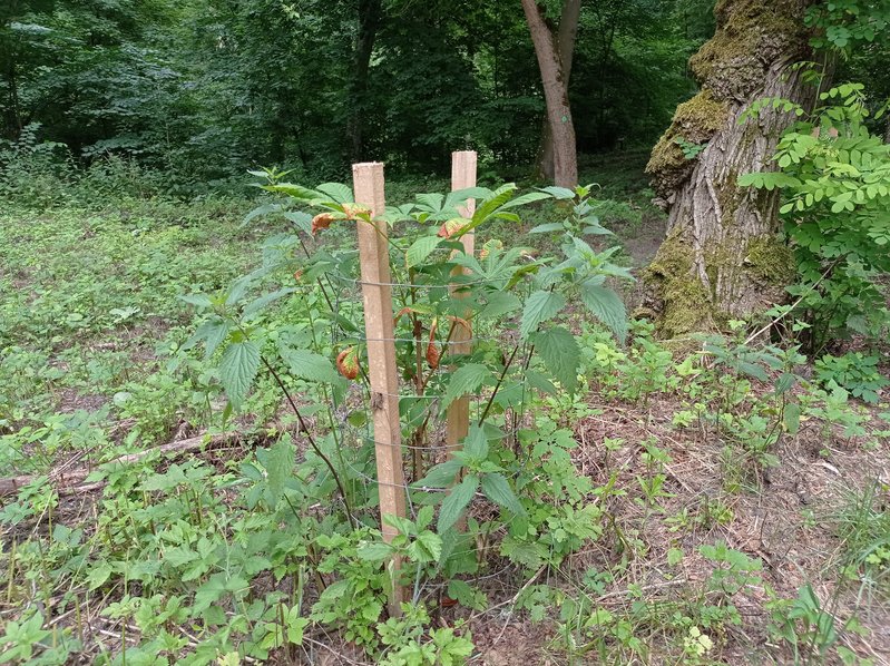 Sadzonki są niewielkie, niespełna metrowe. Teraz przerosły je nawet pokrzywy. Poza tym młode kasztanowce są tak wątłe, że podtrzymujące je paliki mają kilkukrotnie szerszą średnicę. Gdyby sadzonki nie opierały się o siatkę, nie byłoby jak zakotwić ich głównych przewodników (pni) do sporo od nich większych podpór.