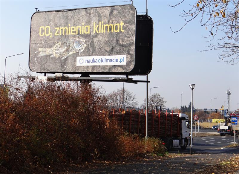 Jest - jak widać: obok billboardu eksponowanego przy ul. 26 Kwietnia właśnie przejeżdża wielotonowy transport świeżo ściętych drzew. Przede wszystkim to powinno poruszać sumienia i przemawiać do wyobraźni. Konkretnie fakt z Raportu Międzyrządowego Panelu ds. Zmian Klimatu przy ONZ (IPCC) z października 2018 r.: dla uporania się z emisją generowaną przez pojedynczą osobę, która jest szacowana na średnim poziomie około 5 kg CO2 rocznie, potrzeba aż 5000 drzew. Żywych, nie martwych!