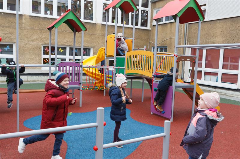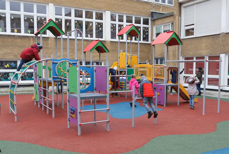 Plac zabaw oprócz tradycyjnych zjeżdżalni, huśtawek, drabinek posiada elementy tzw. małpiego gaju - skałę do wspinaczki, drążki i specjalną siatkę. Zabawy na nim służą usprawnianiu się już najmłodszych uczniów. Podłoże wykonano ze specjalnej amortyzującej, litej gumy, która przez dwa tygodnie od zamontowania nie mogła być używana. Modernizacja kosztowała 500 tys. zł.