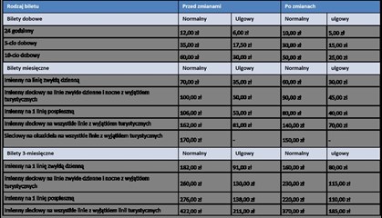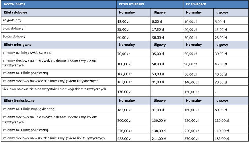 Według przygotowanego projektu uchwały, na dotychczasowym poziomie pozostaną jedynie ceny biletów jednorazowych czasowych na liniach zwykłych dziennych i nocnych oraz pośpiesznych, jak też karnetów 10-przejazdowych. W przypadku pozostałych rodzajów biletów odpłatność za nie będzie niższa.