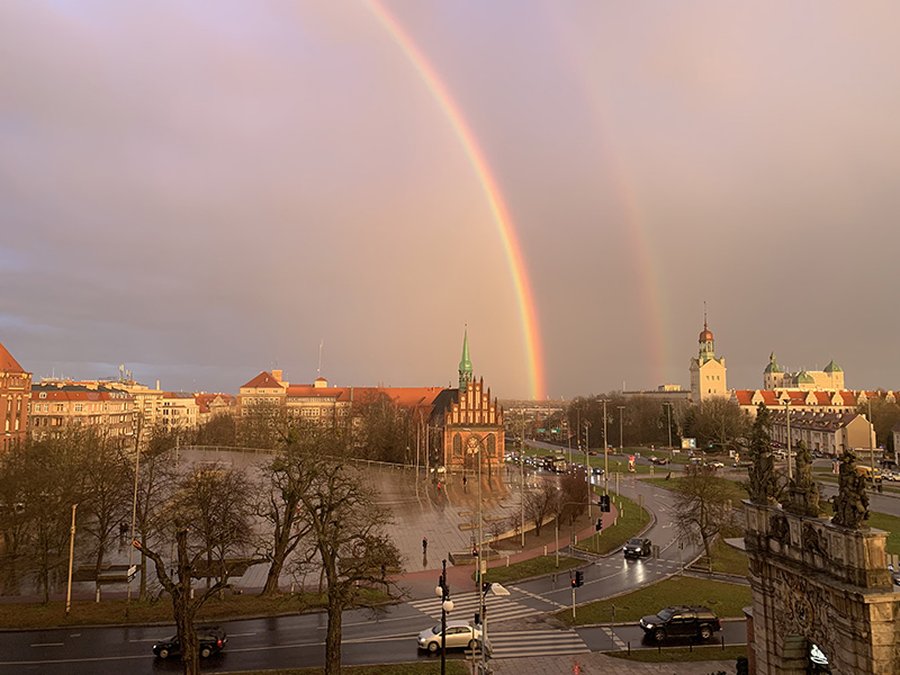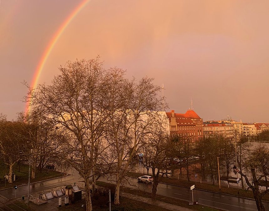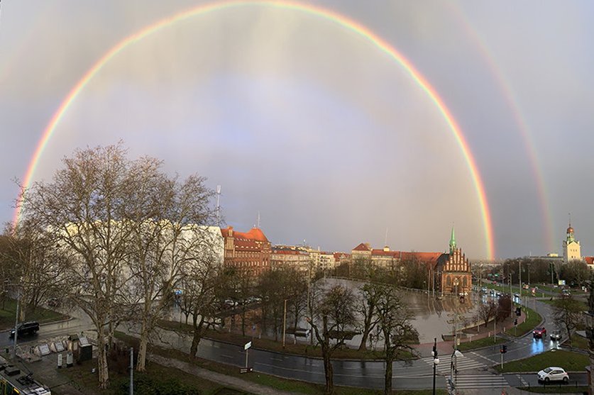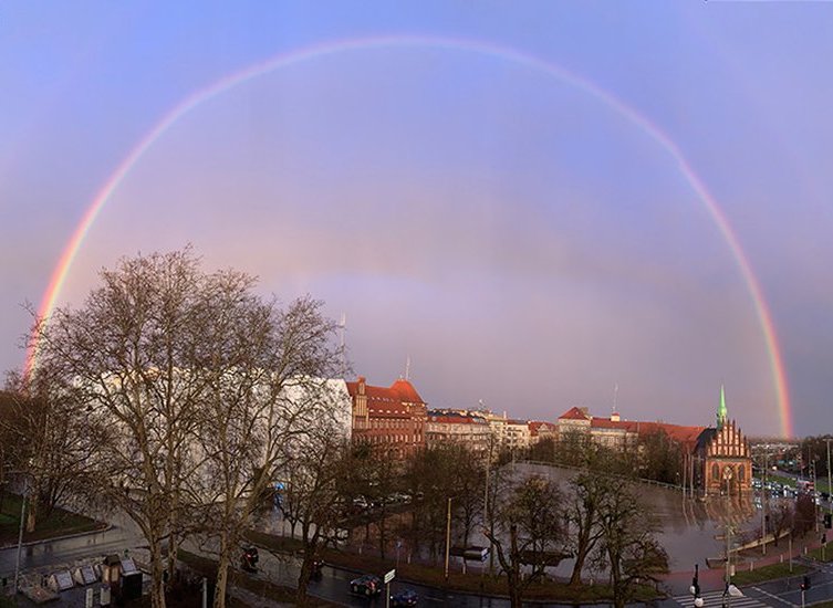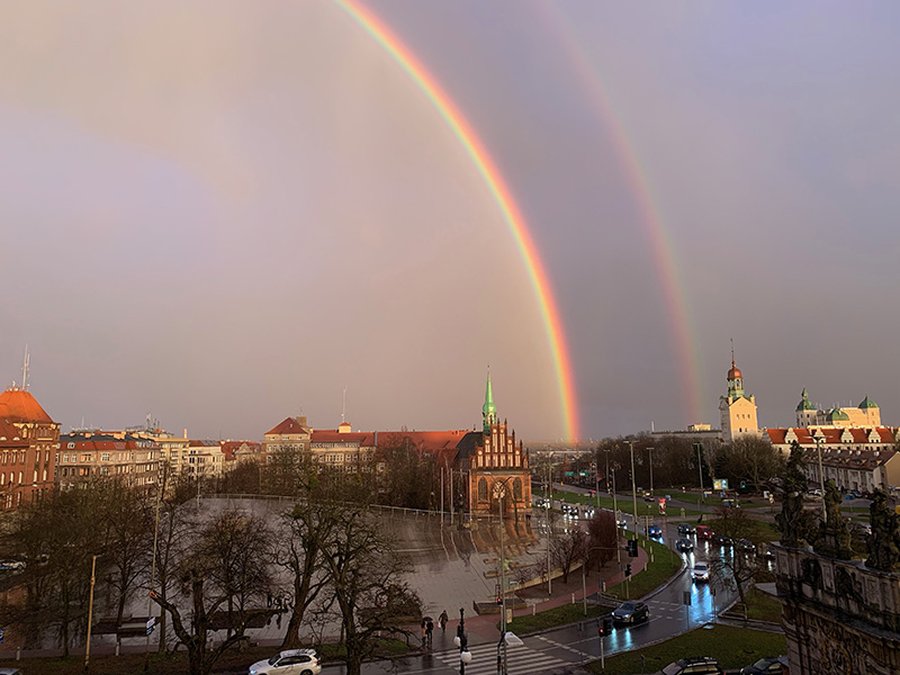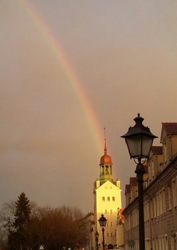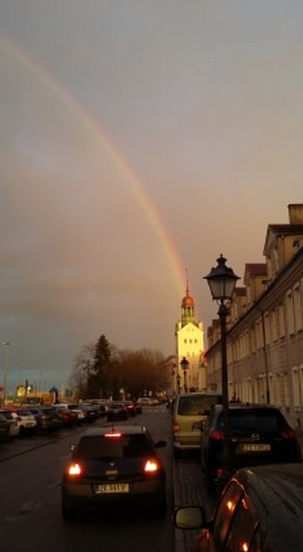 Taki widok roztaczał się z pokoju redakcji tuż przed zamknięciem papierowego wydania magazynowego "Kuriera". Niesamowicie widowiskowe zjawisko atmosferyczne spowodowało, że praca na chwilę stanęła, a nasi pracownicy pełniący tego dnia dyżur zebrali się w oknie fotografując i podziwiając niezwykłą tęczę na wieczornym niebie.