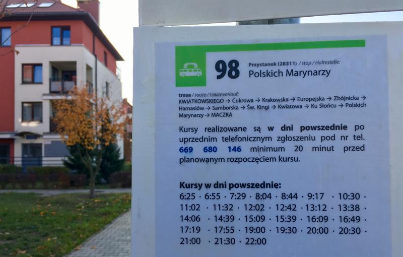 Na dodatkowej trasie linia 98 kursować będzie w dni powszednie tylko w dni nauki w szkołach w godz. 7.40- 15.50. Ponadto na podstawowej trasie linii 98 (Maczka - Kwiatkowskiego) zostanie zmieniony rozkład jazdy w związku z korektą czasu przejazdu na trasie w obu kierunkach.
