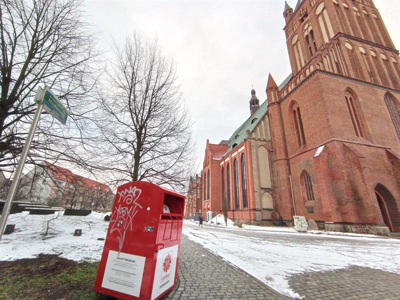 Nie tylko Wtórpolu pojemniki na odzież używaną szpecą szczecińskie Stare Miasto. Uwagę - ostrą czerwienią, napisami i wlepkami - przykuwa również kontener ustawiony przy katedrze.