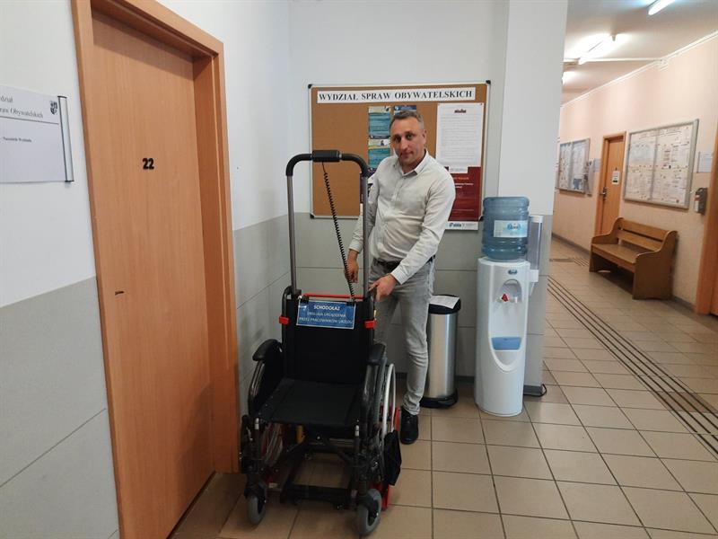 Starostwo w Policach dysponuje także schodołazem, który ułatwia poruszanie się po urzędzie osobom niepełnosprawnym ruchowo, mogą teraz dotrzeć także do sali sesyjnej na drugim piętrze (w budynku nie ma windy). Jest dostępny również dla osób, które nie poruszają się na własnym wózku, ale mają trudności z pokonaniem schodów. W obsłudze tego sprzętu pomaga przeszkolony pracownik. ©℗