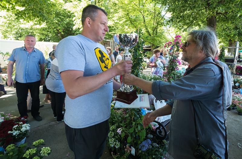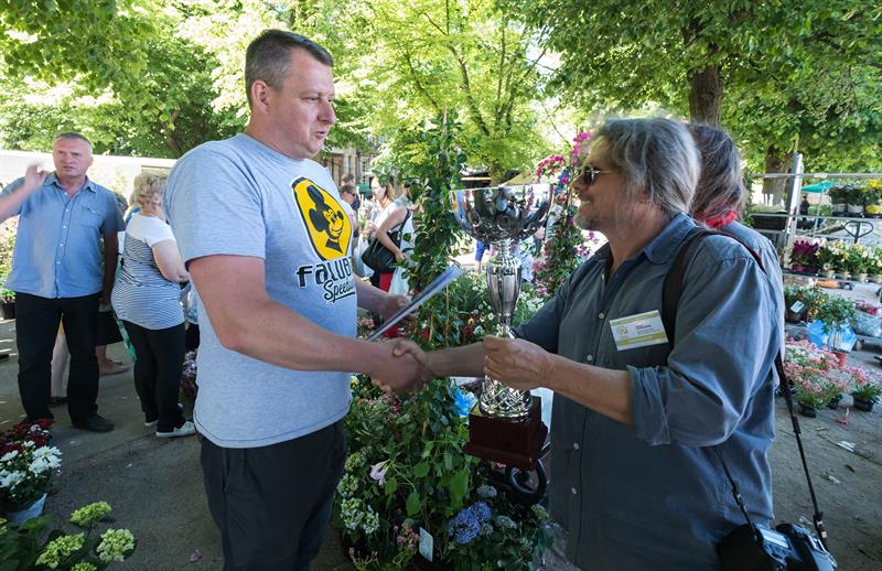 Na zdjęciu: Patryk Przytuła z Zielonej Góry odbiera puchar „Kuriera Szczecińskiego" za najlepsze stoisko wiosennej edycji kiermaszu ogrodniczego „Pamiętajcie o ogrodach" - kolekcję krzewów ozdobnych, firmowaną przez „Iluzję". Prestiżowy laur zwycięzcy wręcza Robert Szyjanowski z FM Szczecin, współorganizator wydarzenia.