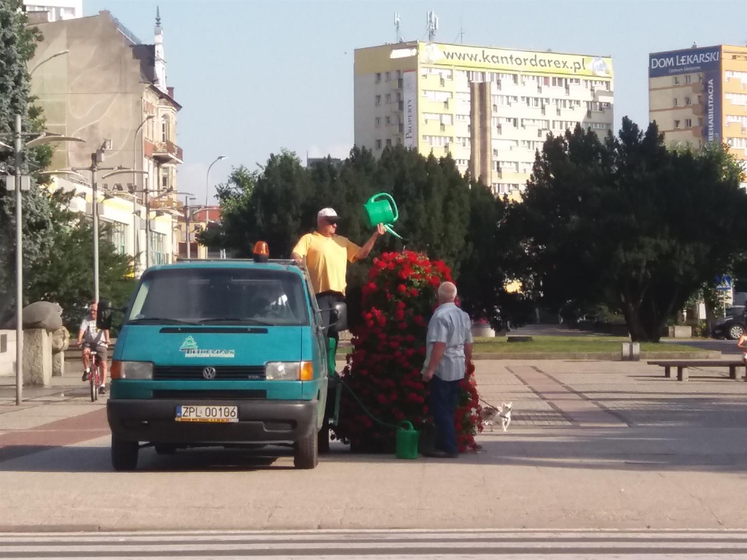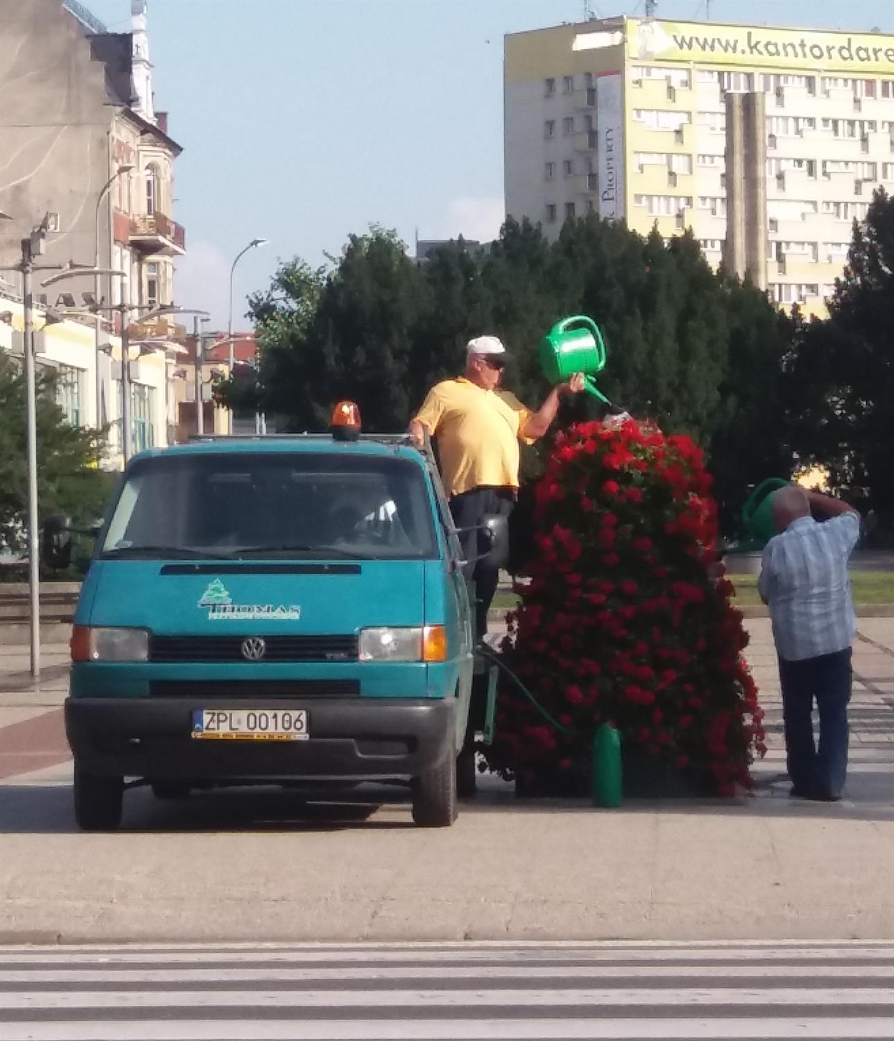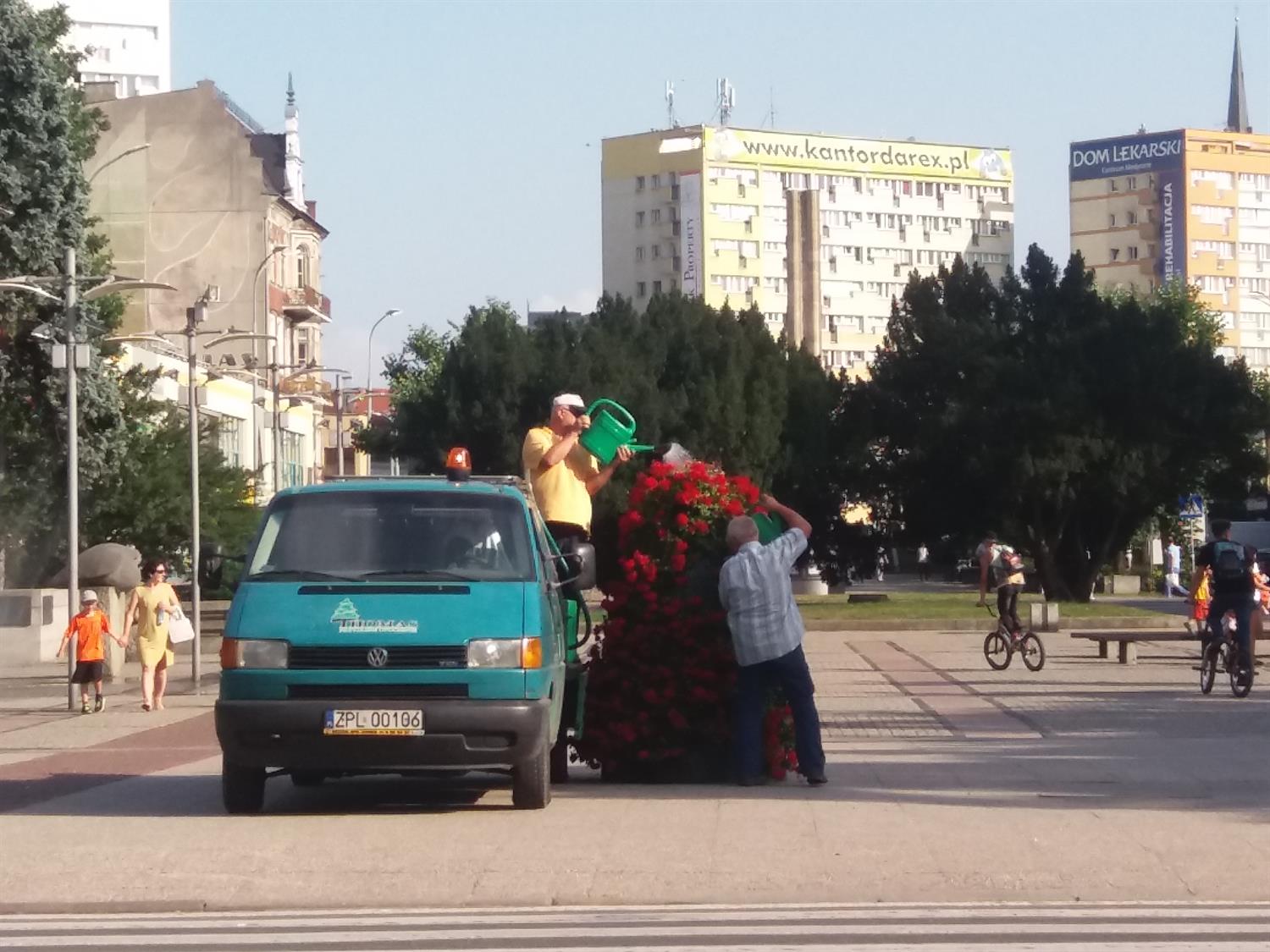Jeden samochód, dwóch mężczyzn i po dwie konewki na kwietnik - tak wyglądało ostatnio podlewanie gazonów z pelargoniami na pl. Lotników. Na dodatek rzecz się działa na długo przed godz. 17, a więc niemal w pełnym słońcu i upale.