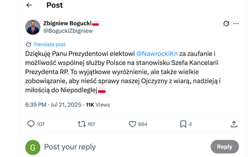 - Dziękuję Panu Prezydentowi elektowi @NawrockiKn za zaufanie i możliwość wspólnej służby Polsce na stanowisku Szefa Kancelarii Prezydenta RP. To wyjątkowe wyróżnienie, ale także wielkie zobowiązanie, ani nieść sprawy naszej Ojczyzny z wiarą, nadzieją i miłością do Niepodległej - napisał Zbigniew Bogucki na platformie X.