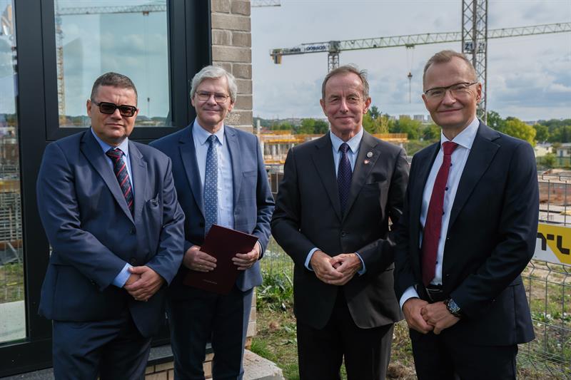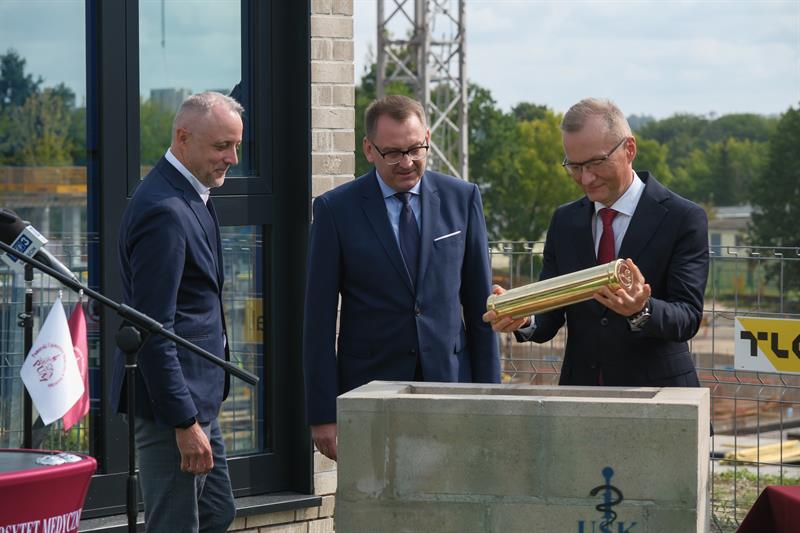 Centrum Medycyny Translacyjnej, Collegium Pharmaceuticum i Centrum Medycyny Klinicznej PUM powstają naprzeciwko szpitala uniwersyteckiego, z którym będą połączone podziemnym korytarzem. W poniedziałek wmurowano kamień węgielny, poza tym złożono kapsułę czasu, w której znalazły się artykuły prasowe poświęcone kolejnym etapom inwestycji PUM.