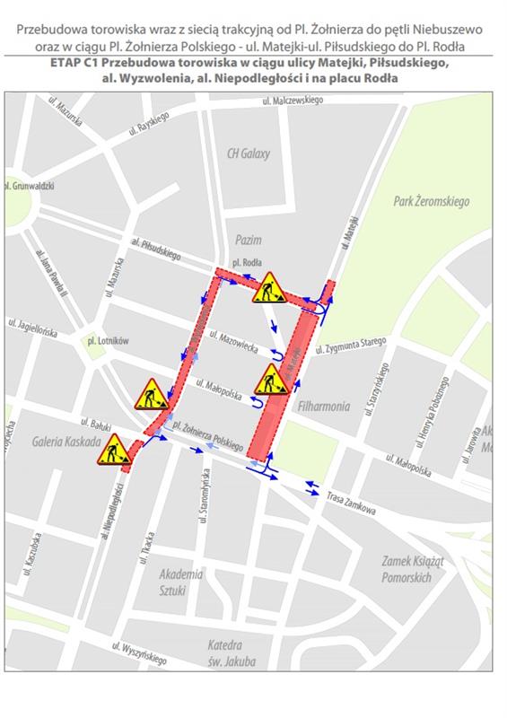 - zamknięte pozostanie torowisko tramwajowe na odcinku od ulicy Piłsudskiego do placu Żołnierza,