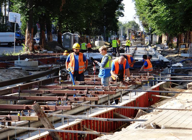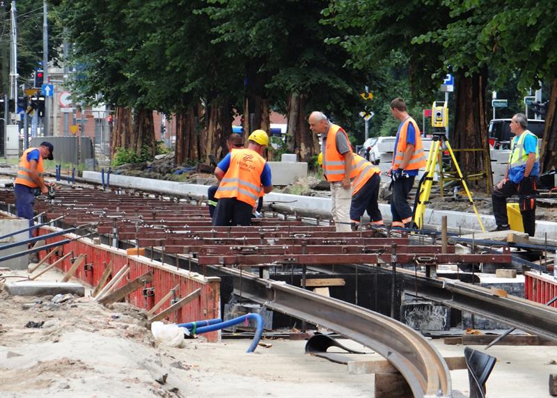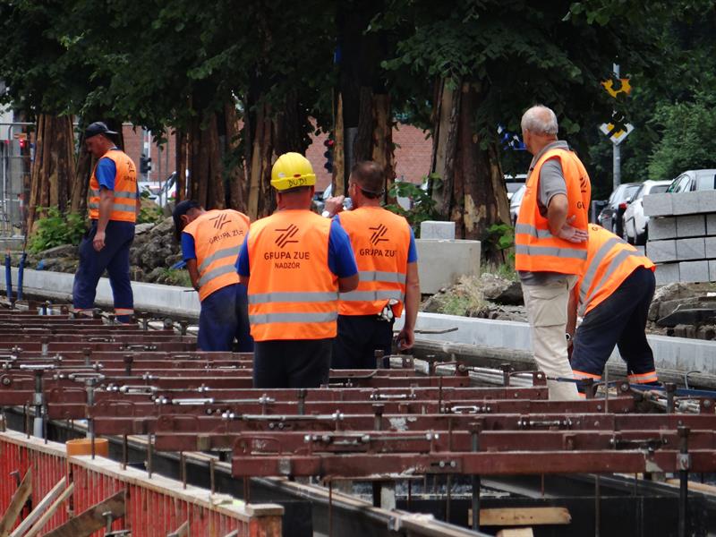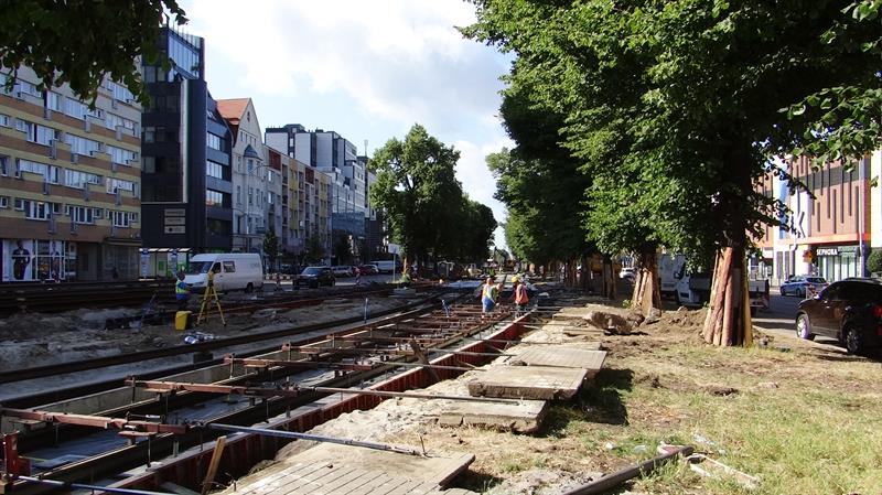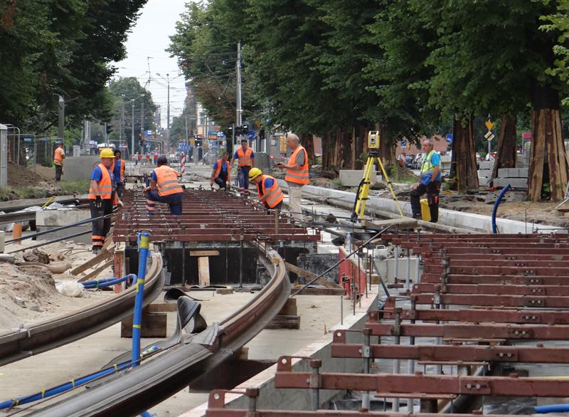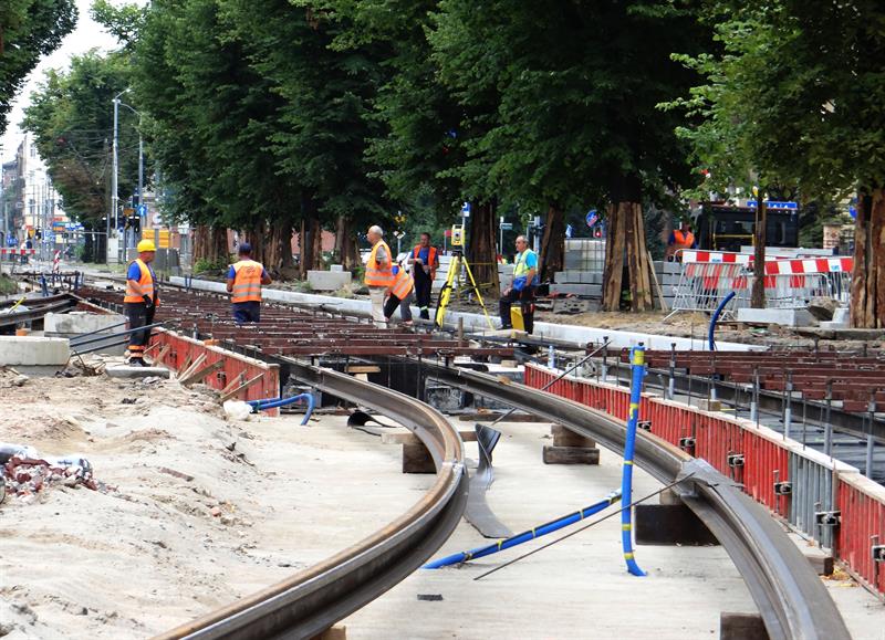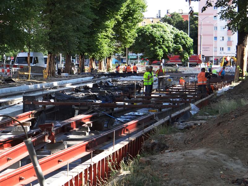 Aktualnie główny rejon robót to pas w al. Niepodległości, gdzie poszczególne odcinki układanych torów już po ich montażu zalewane są następnie warstwą betonu. Z tymi pracami ekipy dotarły do wysokości przystanku przy tymczasowo wytyczonym przejściu dla pieszych w stronę Galerii Kaskada. Trwają również prace rozbiórkowe starej infrastruktury na wyłączonym z ruchu w minioną sobotę przejeździe przez pl. Żołnierza Polskiego od strony ul. Bałuki w kierunku Trasy Zamkowej i w pasie pobocza ze ścieżką rowerową i chodnikiem wzdłuż przejścia dla pieszych. Na wyspie centralnej kontynuowane są prace przy montażu łuków i rozjazdów torowych.