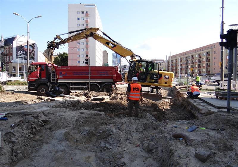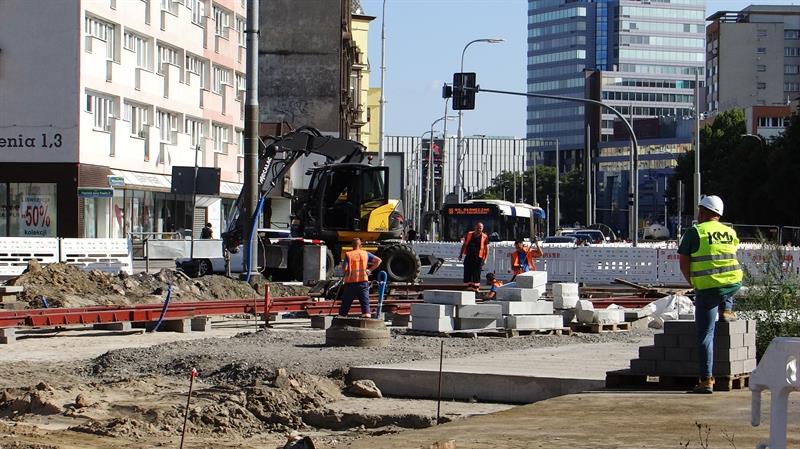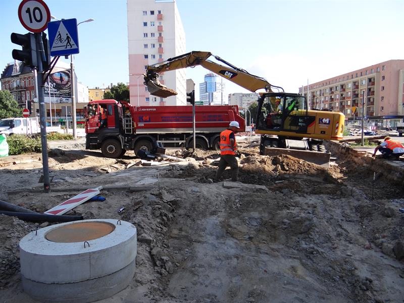 Na centralnej wyspie pl. Rodła wykonane zostały do tej pory prace przy uzbrojeniu podziemnym i grunt szykowany jest już pod ułożenie tam nowych krzyżownic i części rozjazdów. W przygotowanym już wykopie i na utwardzonej warstwie podłoża wzdłuż odcinka ul. Piłsudskiego do skrzyżowania z ul. Matejki szyny obu torów zostały też już na prawie całym odcinku zespawane.
