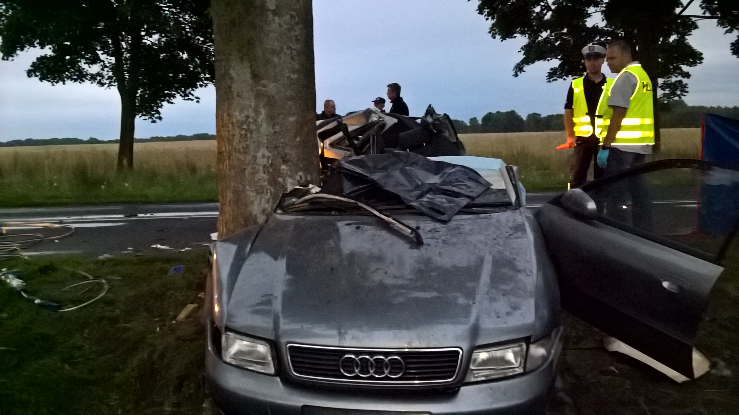 Krótko przed godziną 20 audi kierowane przez młodego kierowcę z Nowogardu wypadło z drogi i uderzyło w drzewo. Boczne uderzenie było tragiczne w skutkach. Kierowca i jedna z dwóch jadących autem dziewcząt zginęli na miejscu, druga kobieta zmarła już po przyjeździe pogotowia ratunkowego. Ocalała tylko trzyletnia dziewczynka, córka jednej z podróżujących samochodem kobiet. Śmigłowiec zabrał ją w ciężkim stanie do szpitala.